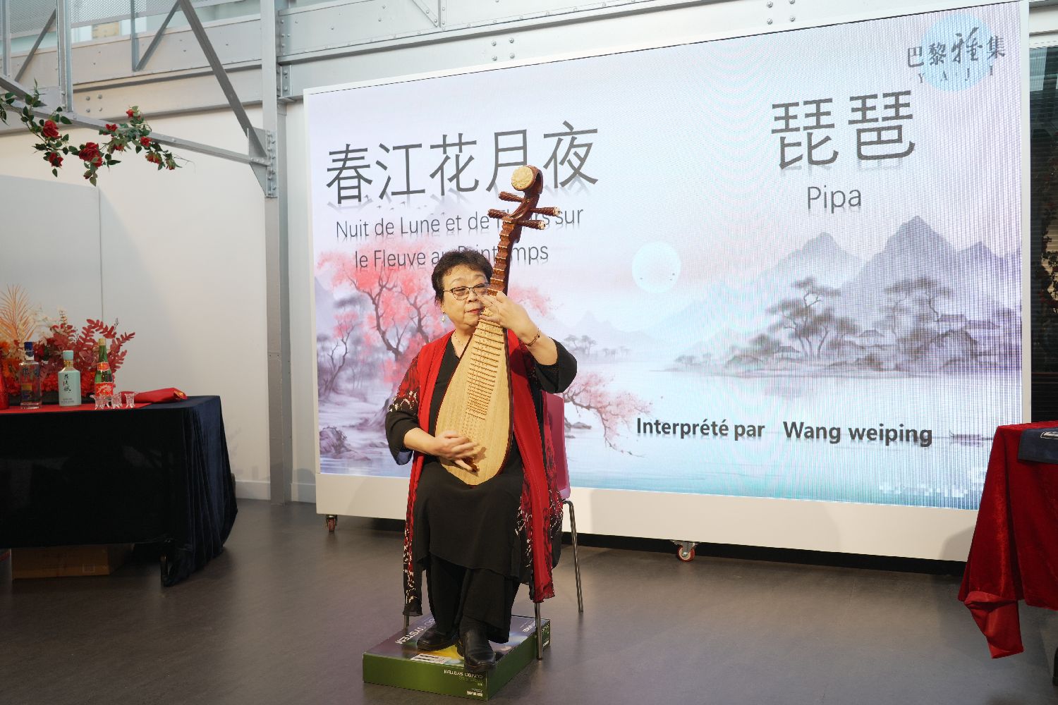 接下来,琵琶演奏与黄酒、白酒赏鉴,以及朗诵舞蹈表演穿插进行。旅居法国的琵琶演奏家王维平现场演奏了《春江花月夜》、《彝族舞曲》、《金蛇狂舞》,为冬日带来活力与暖意。