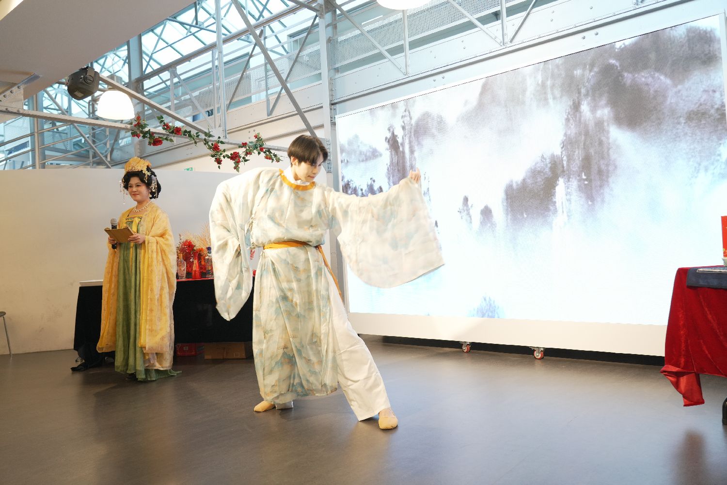 此外,来自法国博衍汉章传统研习会的成员们身着汉服进行了《将进酒》为题的舞蹈与朗诵表演,并邀请来宾现场试穿汉服。