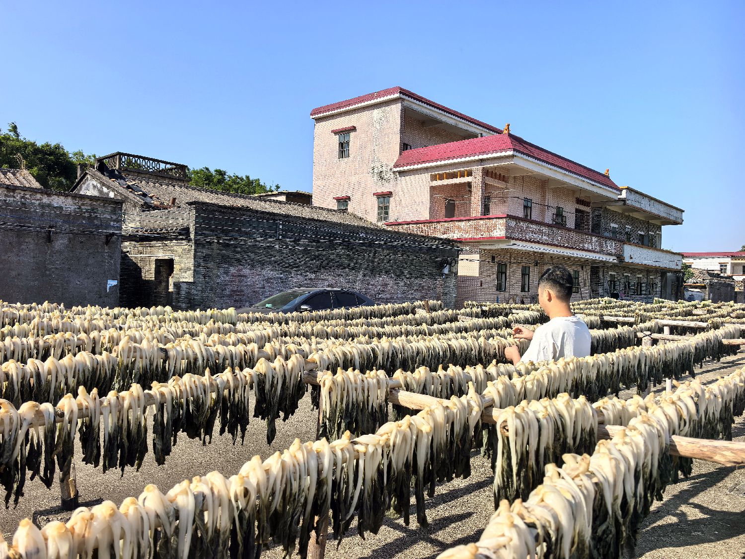 “这一批晒了三天,已完全干透,轻抓容易断或碎,需小心收集起来,再安排时间装袋打包。”村民陈群添说,村场上架起的一排排竹竿,是他们晾晒菜干的主阵地。烫煮过的白菜经清洗后,在阳光和北风的双重作用下,水分会迅速蒸发。溢出的一缕缕菜香和乡味交织在一起,很容易勾起台山人的味蕾记忆。