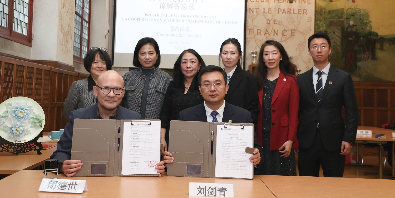 【欧洲时报记者马行健巴黎报道】当地时间12月12日,中国教育部中外语言合作交流中心(以下简称“语合中心”)与法国汉语教学协会在巴黎签署《中国教育部中外语言交流合作中心与法国汉语教学协会关于中文教育合作的谅解备忘录》,共同推动中法中文教育领域交流与合作、促进法国中文教育发展、提升法国本土中文教师的专业能力。中国教育部中外语言合作交流中心副主任刘剑青、汉语教学协会协主席闭德世(Georges BêDuc)、副主席黎静等出席活动。