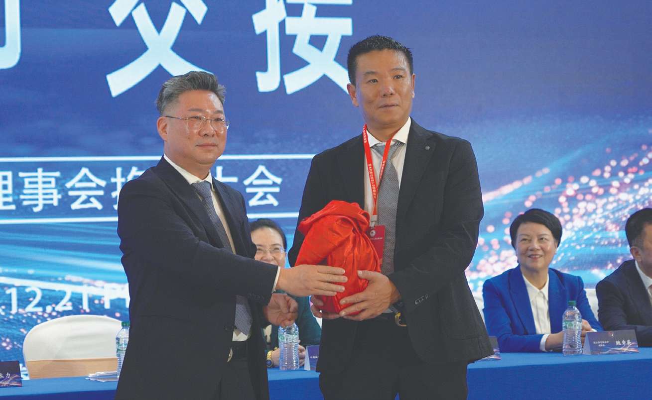 黄晓龙(左)与新任会长陈洲交接会印。