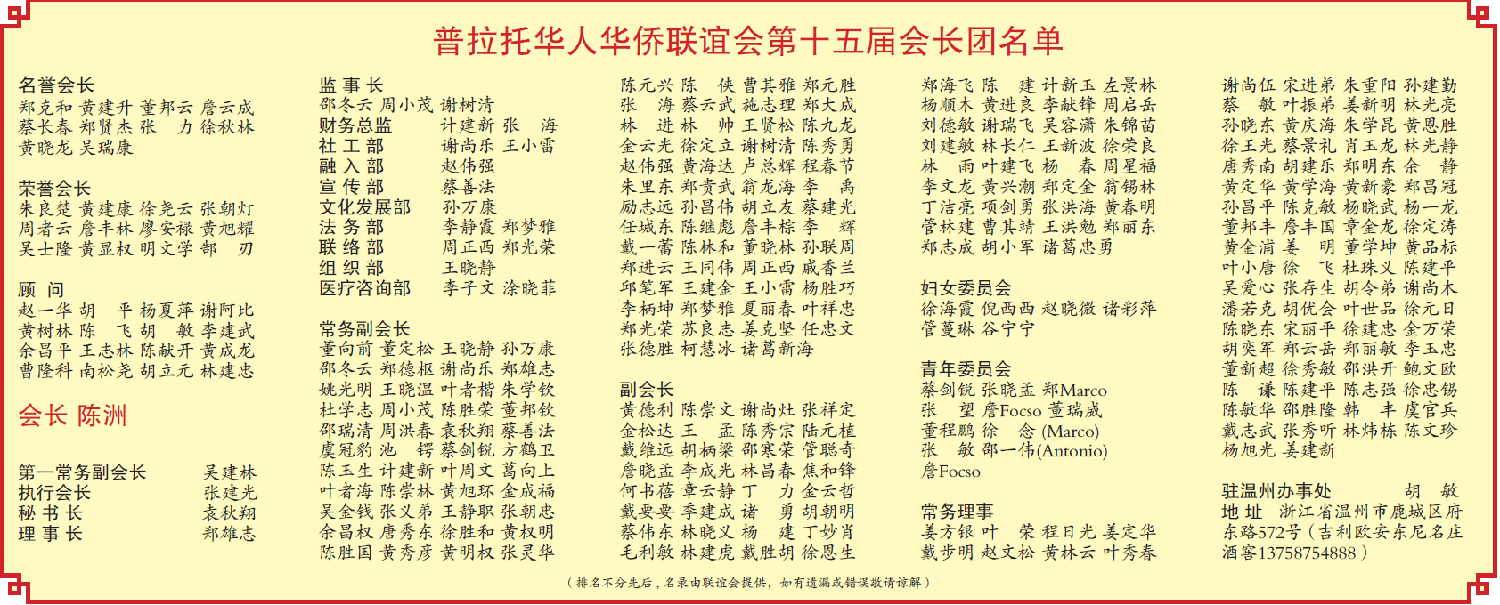 【欧洲时报特约记者尹名兴普拉托报道】12月21日,意大利普拉托华人华侨联谊会第十五届理事会换届庆典大会在普拉托举行。陈洲众望所归当选新一届会长。中国驻佛罗伦萨总领事尹琦、浙江省海外联谊会副会长鲍秀英、温州市侨联副主席董邦云,佛罗伦萨领区以及意大利和欧洲部分国家的侨团代表、各界友人共500余人出席大会。