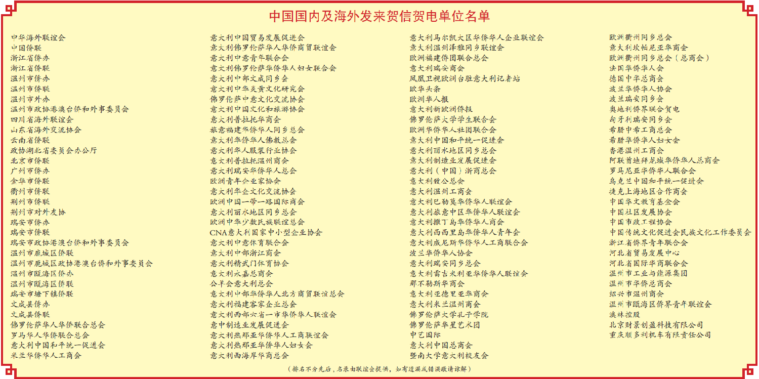 中华海外联谊会、中国侨联为大会致发贺信,高度肯定该会长期以来团结服务广大侨胞、积极促进中意民间友好交流与合作所发挥的积极作用。