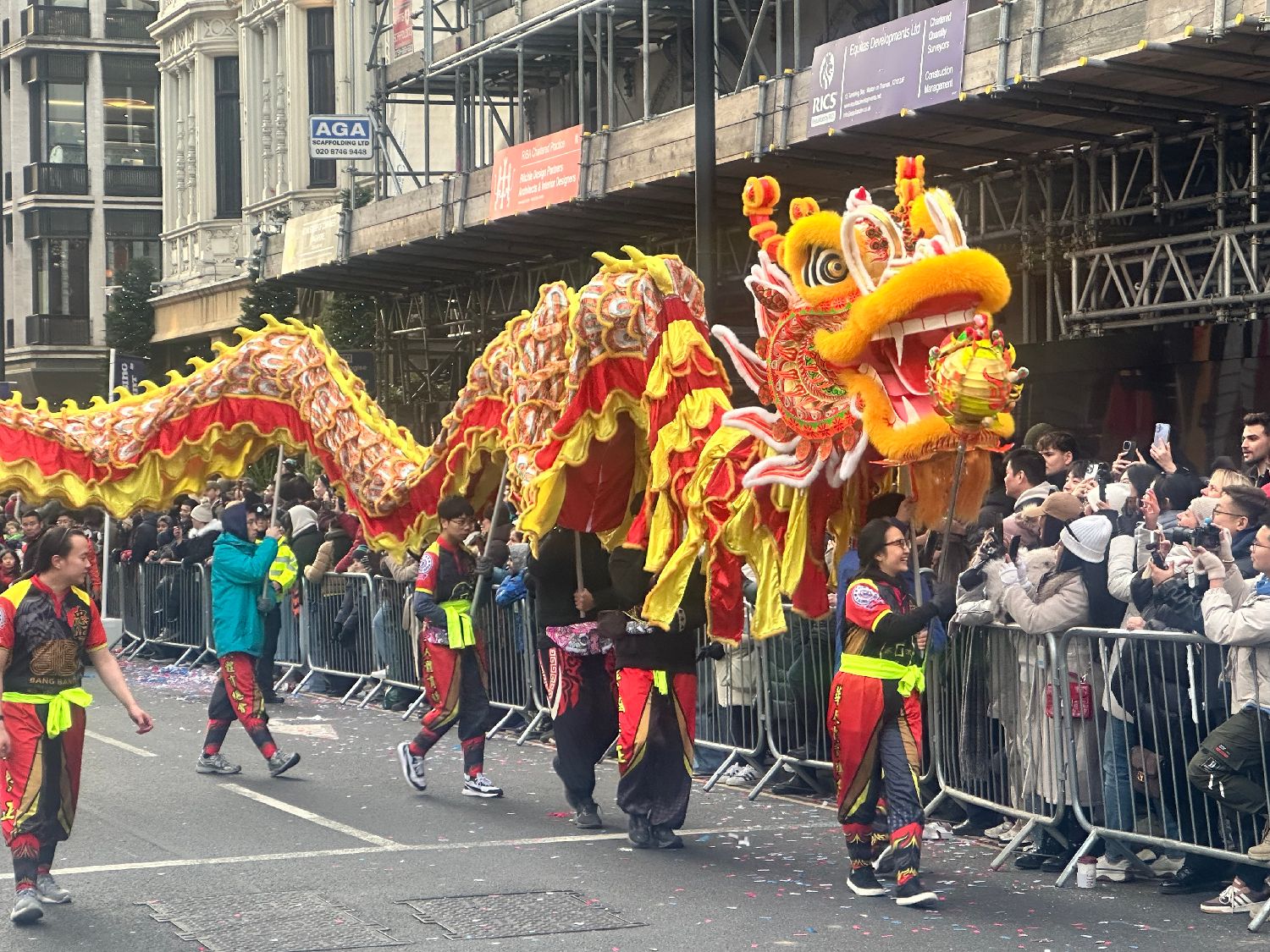 伦敦华埠商会组织巡游队伍作为48号方队亮相,现场,“祥龙”在铿锵鼓点中起伏翻腾,双层巡游车上的华社代表用中英双语高喊“新年快乐”,憨态可掬的大熊猫造型表演者穿梭其间,与观众牵手击掌,不少市民举起手机记录这一精彩瞬间。
