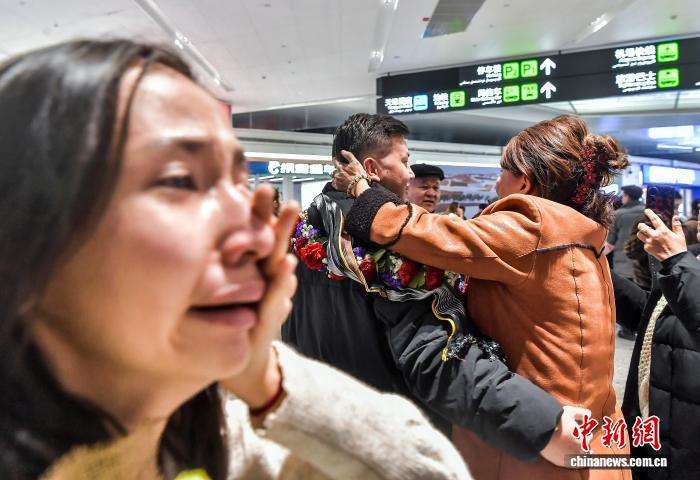图为新疆籍侨胞在机场和亲属相见。(图片来源:本文图片均来自中新网)