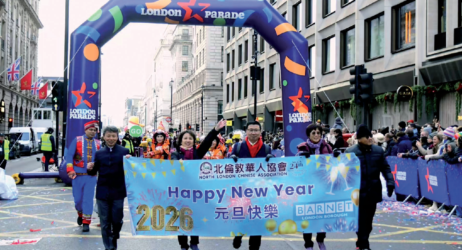 【欧洲时报】2026年1月1日,英国北伦敦华人协会(NLCA)代表伦敦巴尼特市(Barnet London Borough)参与了伦敦一年一度的元旦巡游活动。该活动由大伦敦市政府主办,于每年元旦下午举行,并得到英国主流电视媒体的现场直播。