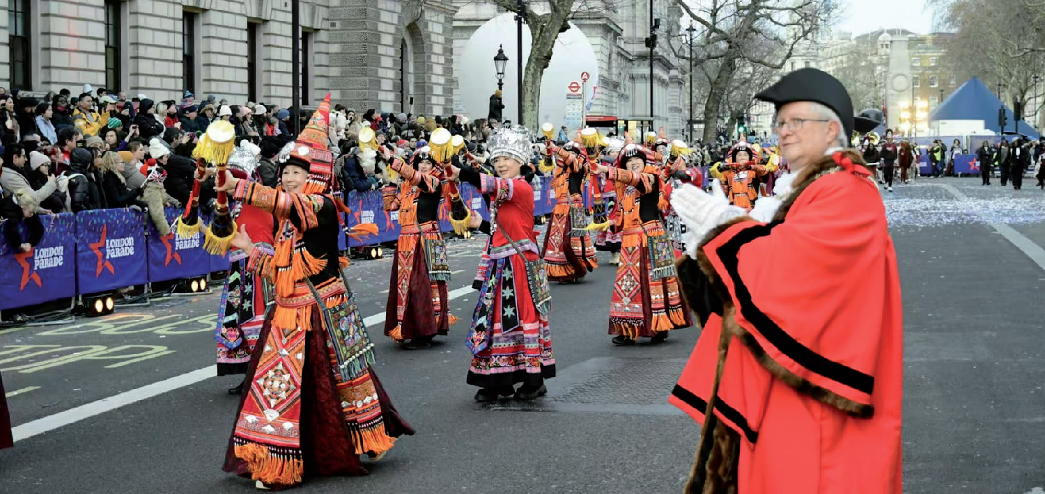 当天下午1时,巡游在漫天彩纸与礼花中开始。NLCA队伍由理事王朔光、志愿者Alice、Henry及赵祚良手持“恭贺新年”横幅引领开路,英国广西联谊总会的瑶族长鼓舞队随乐起舞,步伐轻盈、鼓声悠扬。道路两旁观众情绪高涨,随之舞动呼应。行至白厅路段时,气氛达到高潮,欢呼互动不断。