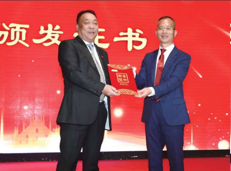 新一届会长马可瑞向老会长项新煌颁发终身名誉会长证书。