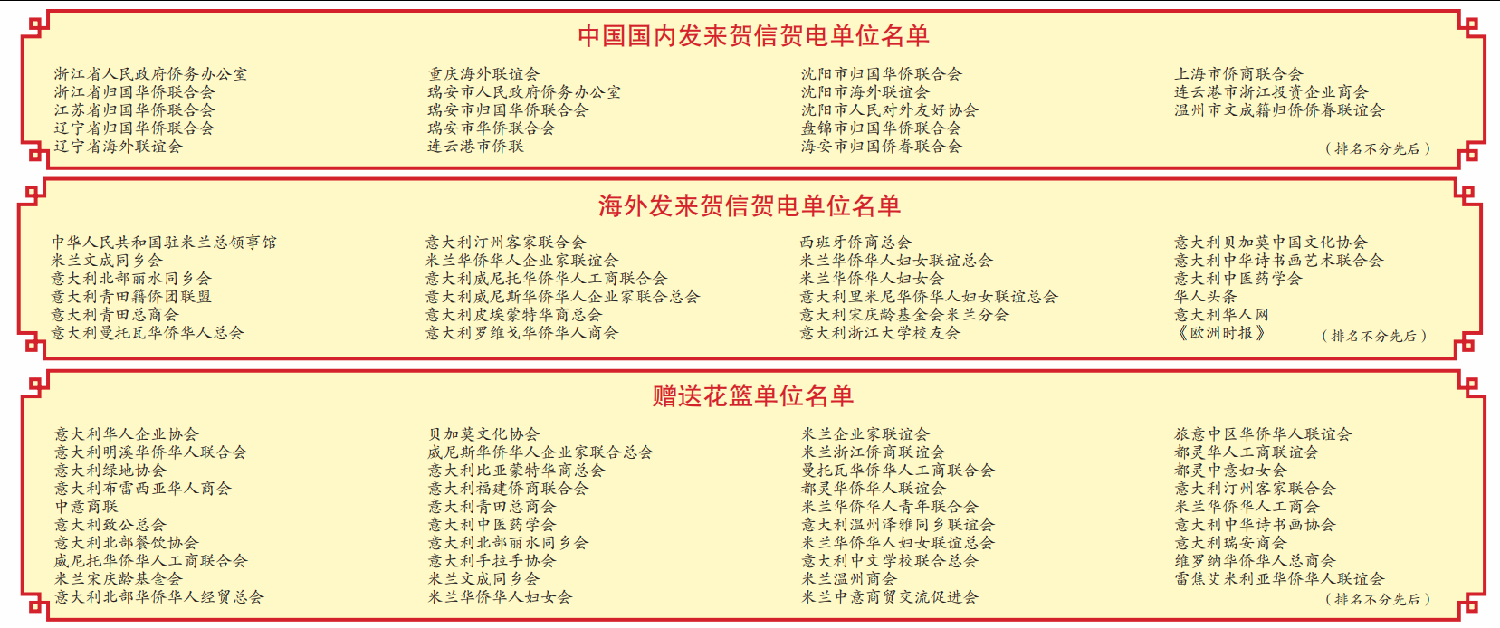 从左至右分别为:执行会长黄国志宣布换届庆典大会开幕;执行会长李万春宣读中国驻米兰总领馆发来的贺电;执行会长陈炜宣读浙江省侨务办公室发来的贺电。