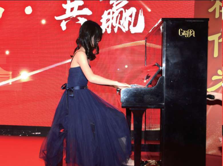 青年部部长马欣洋弹奏钢琴名曲献礼庆典大会。
