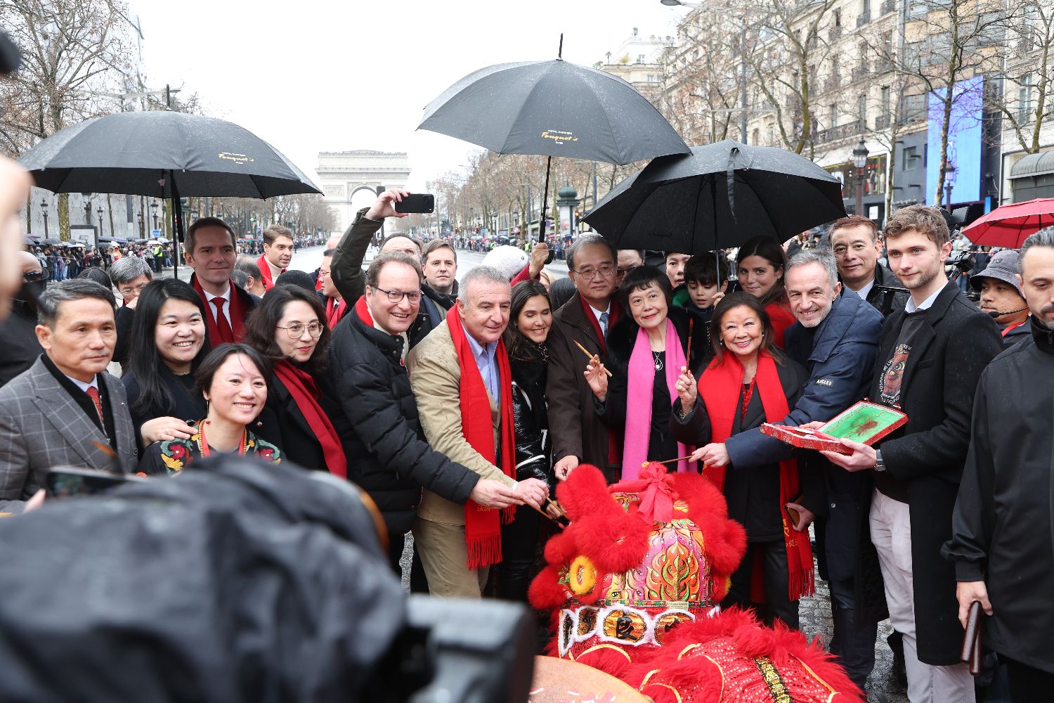 【欧洲时报记者马行健巴黎报道】当地时间2月1日,第四届“欢乐春节满巴黎,龙狮贺岁舞香街”春节巡游活动在巴黎香榭丽舍大街成功举办。中国驻法国大使邓励与夫人张华女士,巴黎香榭丽舍大街管委会主席马克-安托万·加麦(Marc-Antoine Jamet)、中国驻巴黎旅游办事处主任张郝淼、巴黎八区区长奥特赛尔(Jeanne d'Hauteserre)、巴黎富凯酒店总经理Julien Gardin、法国华人贸易促进会会长林相伟等出席活动。