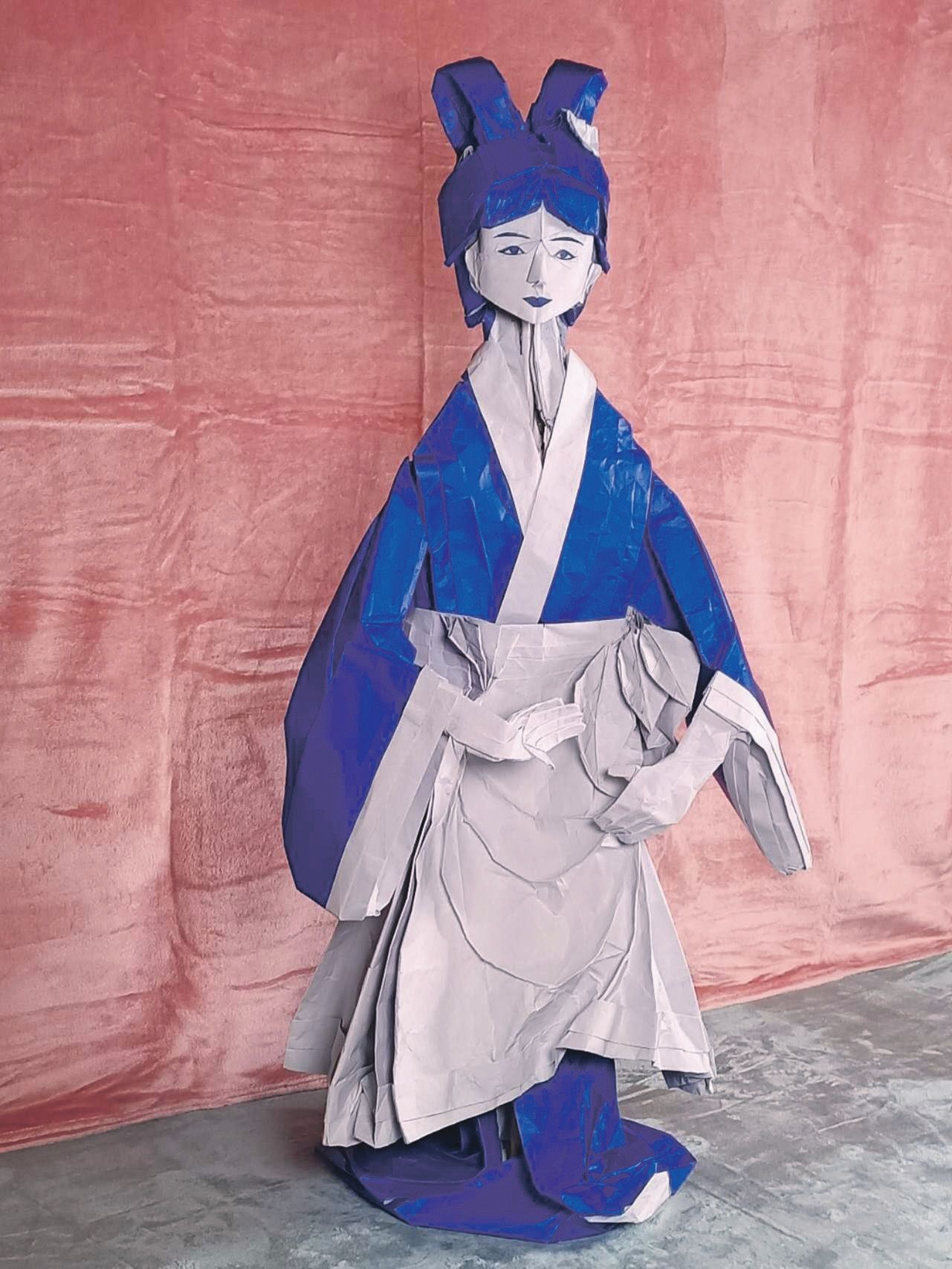 《莫愁烟雨》取材于“金陵四十八景”之一,作品主体“莫愁女”由一张边长2.8米、正面蓝色、背面白色的正方形纸张折叠而成。整个创作过程不剪不裁、不额外上色、不加纸,成品高度约一米。人物面部细腻而克制的双色五官,完全由纸张边缘翻色形成,在折纸艺术史上尚属全球首创。这种高度自律的技术路径,使作品在视觉呈现之外,天然携带了一种关于“限制”“耐心”与“结构逻辑”的时间感。