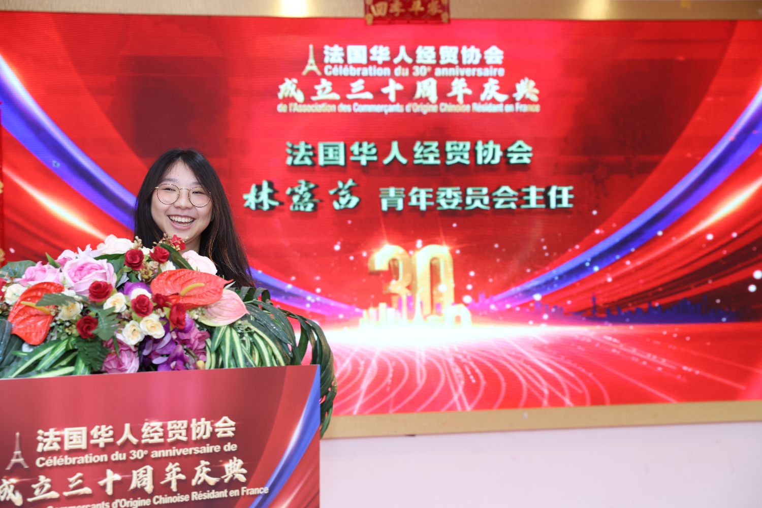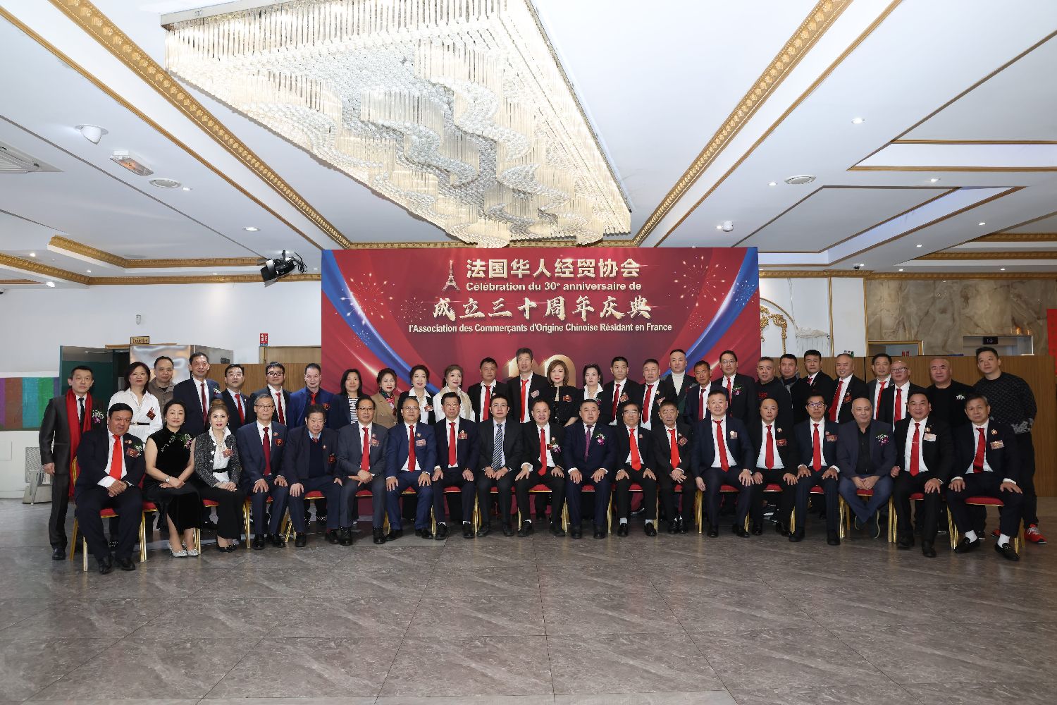 在会长团成员的雄壮的《我的中国心》歌声中活动拉开序幕。执行会长刘卫东宣布庆典开始,在共唱中法国歌后,大家共同通过视频短片回望法国华人经贸协会自1996年创会以来的历程和成就。