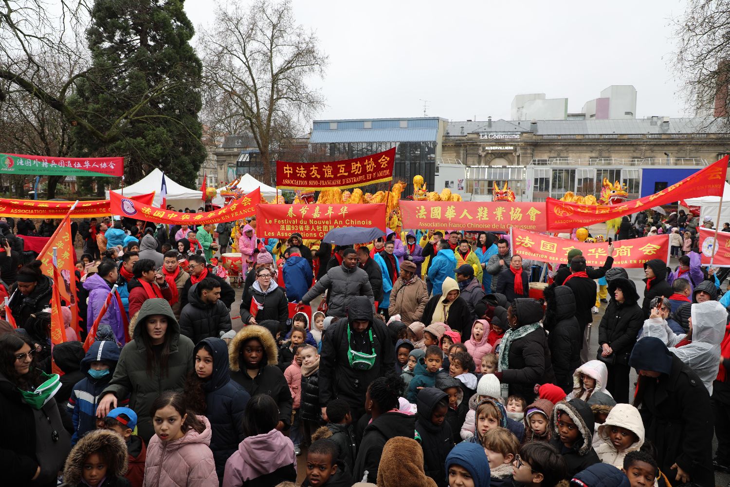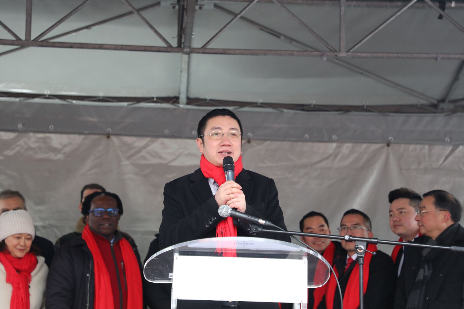 【欧洲时报记者黄冠杰巴黎报道】2月18日,大年初二,巴黎淫雨霏霏,雨紧一阵缓一阵,没有停歇。斜风细雨浇不灭巴黎人庆祝中国春节的热情。在巴黎北郊华人进出口批发集散地欧拜赫维利埃市张灯结彩、喜气洋洋,当地法华民众雨中欢聚在当地斯大林格勒公园广场,共同庆祝农历火马年春节。中国驻法国大使馆领侨处万磊参赞、任家俊秘书、查君酽秘书,欧拜赫维利埃市第一副市长皮埃尔·萨科(Pierre Sack)、副市长田玲,以及中法友谊互助协会等旅法侨界各协会会长及代表等出席活动。