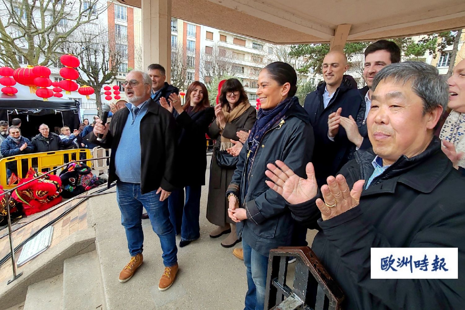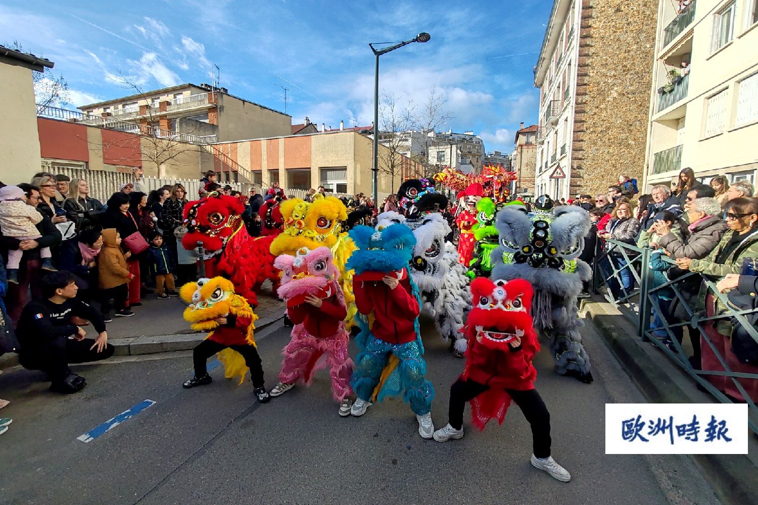 21日当天,塞纳河畔阿涅和库尔布瓦两市共同举办庆祝活动,邀请法国当地的华人舞狮表演队巡游表演,让当地民众一起分享新春的喜悦。