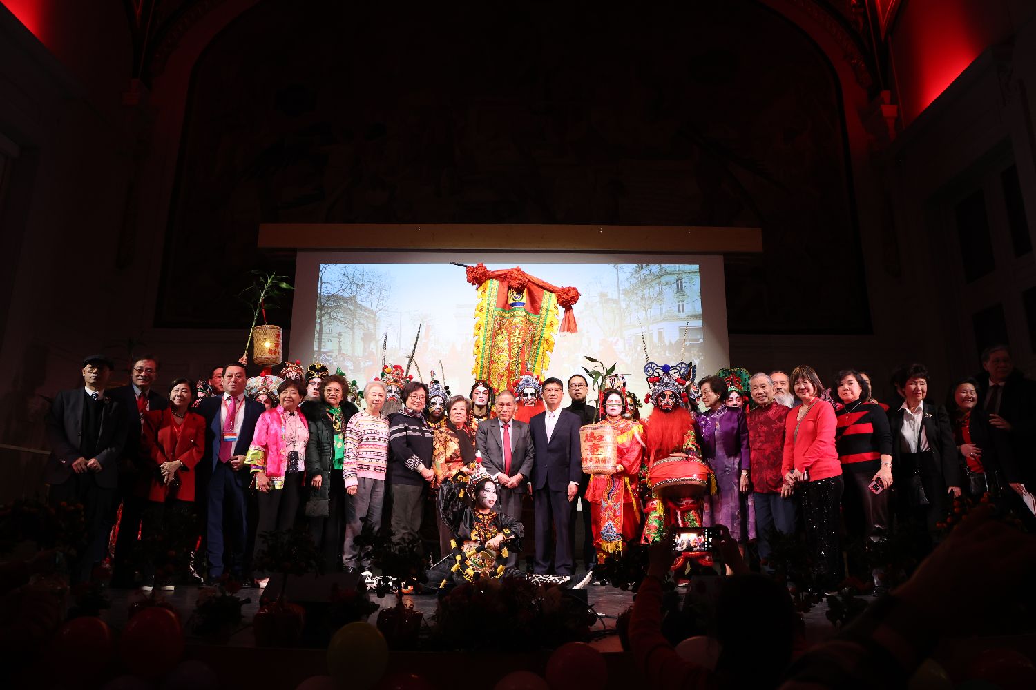 本次活动的压轴节目是法国潮州会馆青年组带来的英歌舞,节目一开始便吸引全场人员的关注,众多观众纷纷离开座位尽可能靠近舞台,以拍摄精彩的演出画面,演员们认真的演出和观众们极高的人气,将现场气氛推向最高潮。演出结束后,现场嘉宾还登台与演员们合影留念。