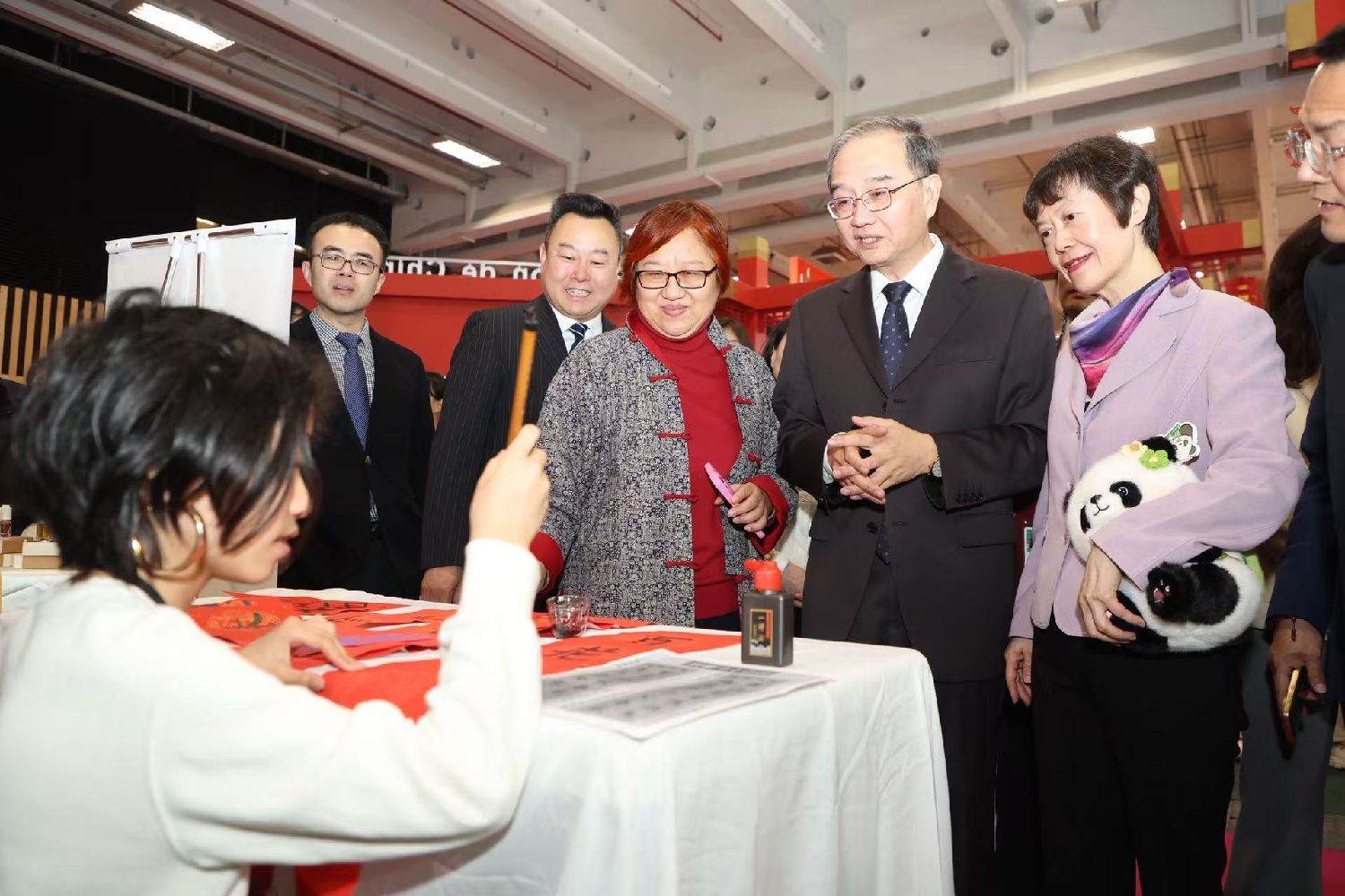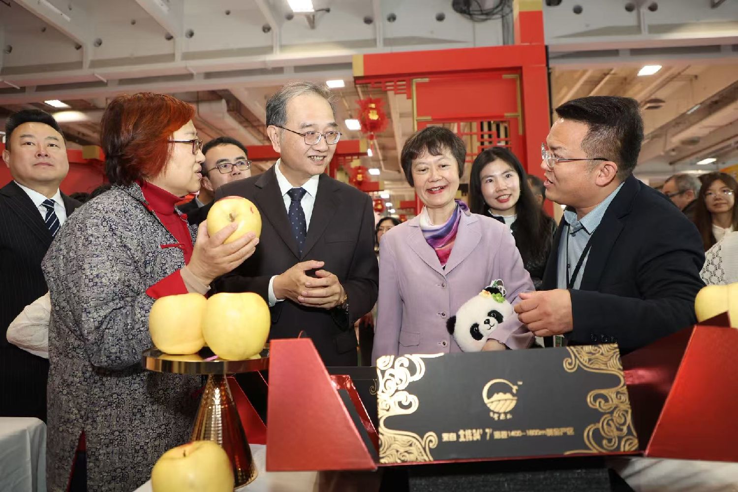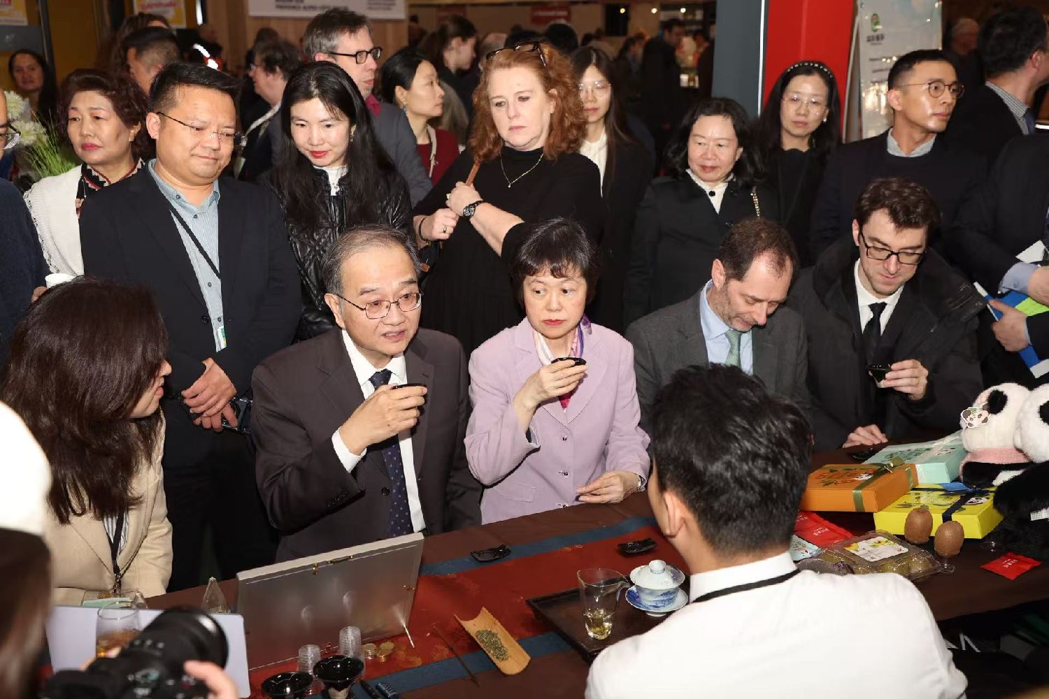 在中国馆,邓励参观了馆内的每个展台,听取各展台负责人员的介绍和讲解,并积极进行交流,了解展品具体细节、出口至法国与否等细节信息。参观尾声,邓励还应邀同中国馆工作人员合影留念。