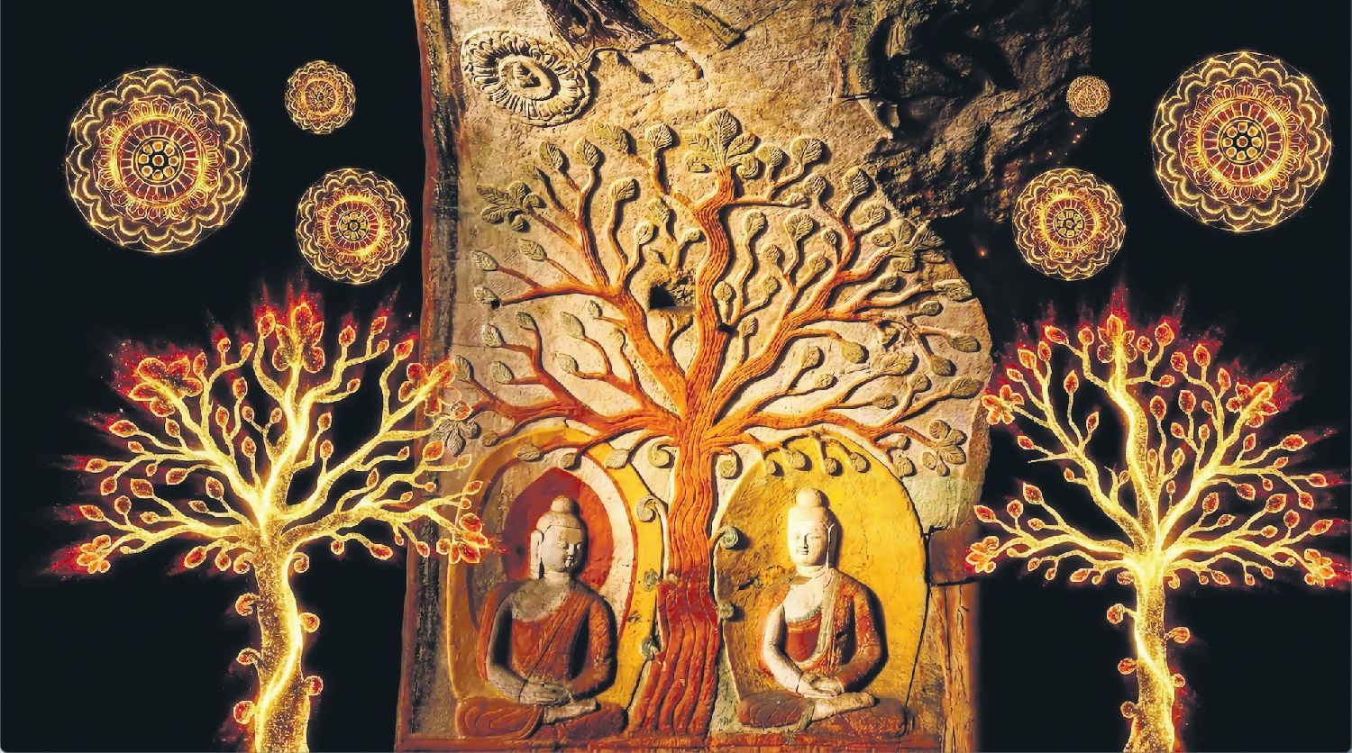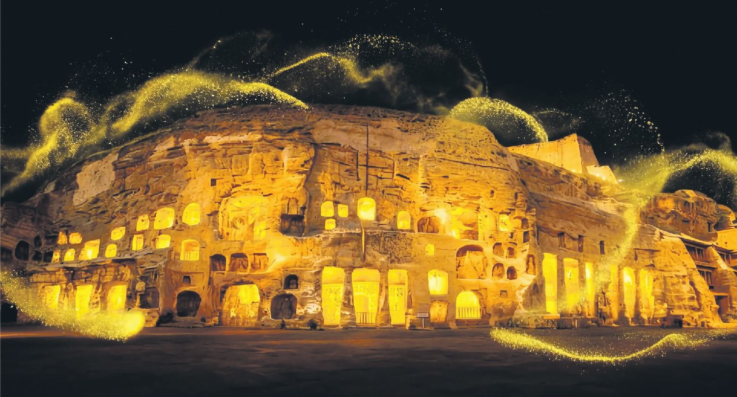 云冈石窟是中国佛教石窟艺术的杰出代表之一,已被列入《世界遗产名录》。光雕秀以当代数字影像语言,呈现云冈石窟的独特艺术气韵:飞天、伎乐、莲花纹样与佛造像等石窟元素在建筑立面上流动铺陈,配合音乐与节奏,将厚重的文化遗产转化为一段可被“第一次接触者”轻松进入的沉浸体验。它不急于讲述历史,而是把“美的震动”作为入口——让观众在短暂的仰望里生出好奇,进而愿意走近、想要了解更多。