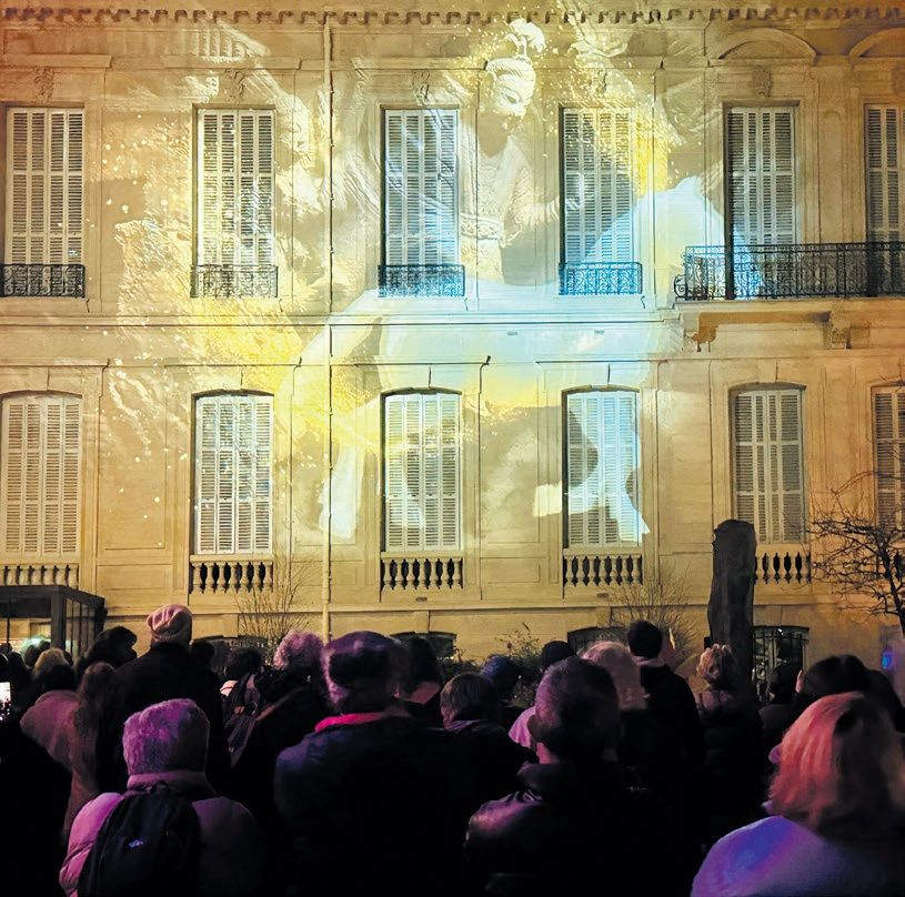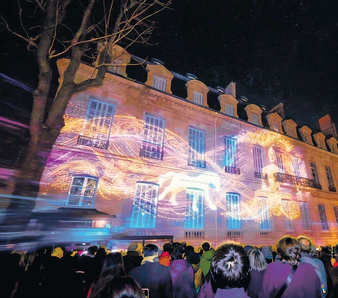 光雕秀即将开始时,庭院的喧闹仿佛被轻轻按下暂停键。每场放映前,主持人都会用简短互动把观众带入情境:欢迎第一次来到中心的朋友,向大家介绍云冈石窟的基本背景,也顺势带领观众了解巴黎中国文化中心全年丰富的课程、展览、讲座与演出项目,并不时邀请观众分享“你是怎么找到这里的”、是否去过中国等小故事。这些轻盈而真诚的交流,让现场不再只是“观众的集合”,更像一次在城市夜色里的“社区相遇”。随后,人群抬头仰望,光影沿着建筑立面缓缓铺开。十余分钟的观影过程中,音乐在庭院里回荡,观众不时发出轻轻的惊叹;不少人举起手机拍照、录影,屏幕的微光与墙面的光影交相辉映。画面在终章处定格的一刻,庭院里随即爆发出热烈而持久的掌声。