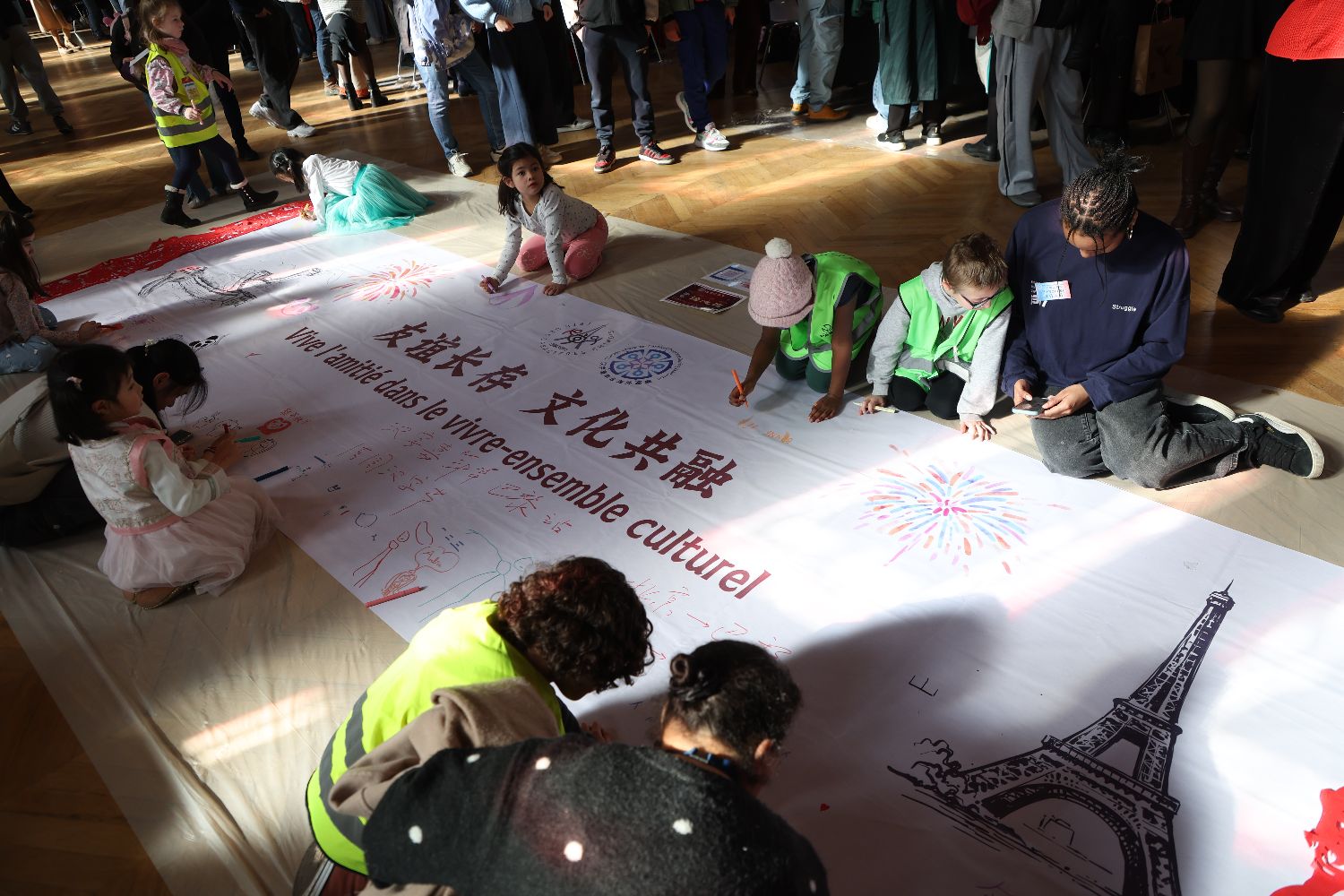 来自北京的“汉字嘉年华”的首次加入是本次巴黎汉字节的一大亮点,现场不仅有“汉字嘉年华”的专门展台,供参与者继续体验,而且现场地面还铺设一幅主题为“友谊长存文化共融”的横幅,让大家进行自由创作。中外语言交流合作中心五洲汉风创新事业部总监桂帆表示,此次活动的现场反馈达到预期,未来也期待赴巴黎参加活动常态化。