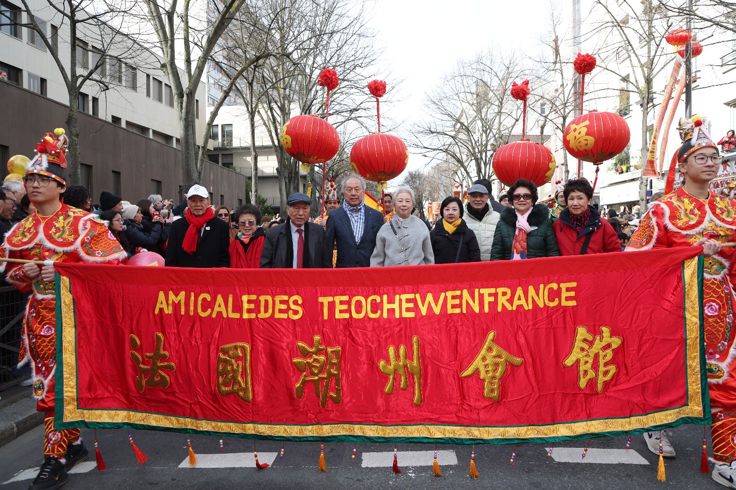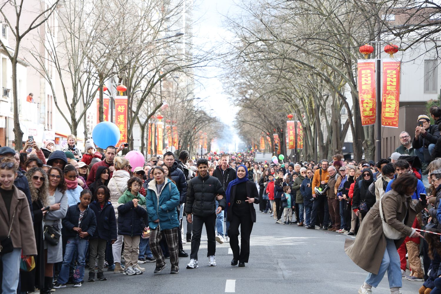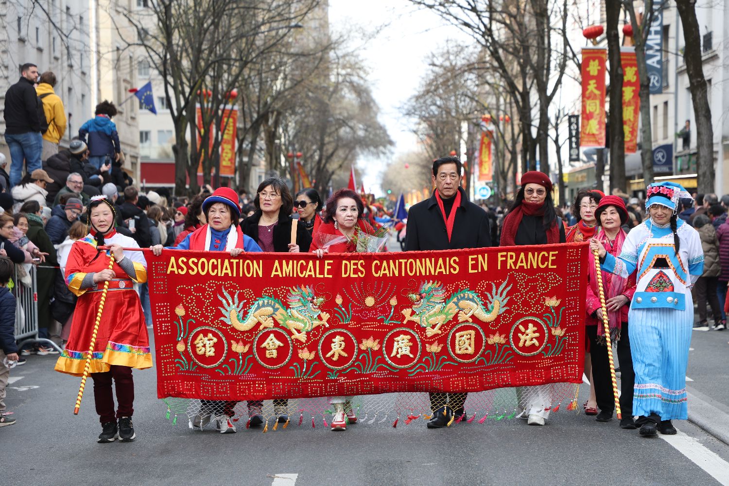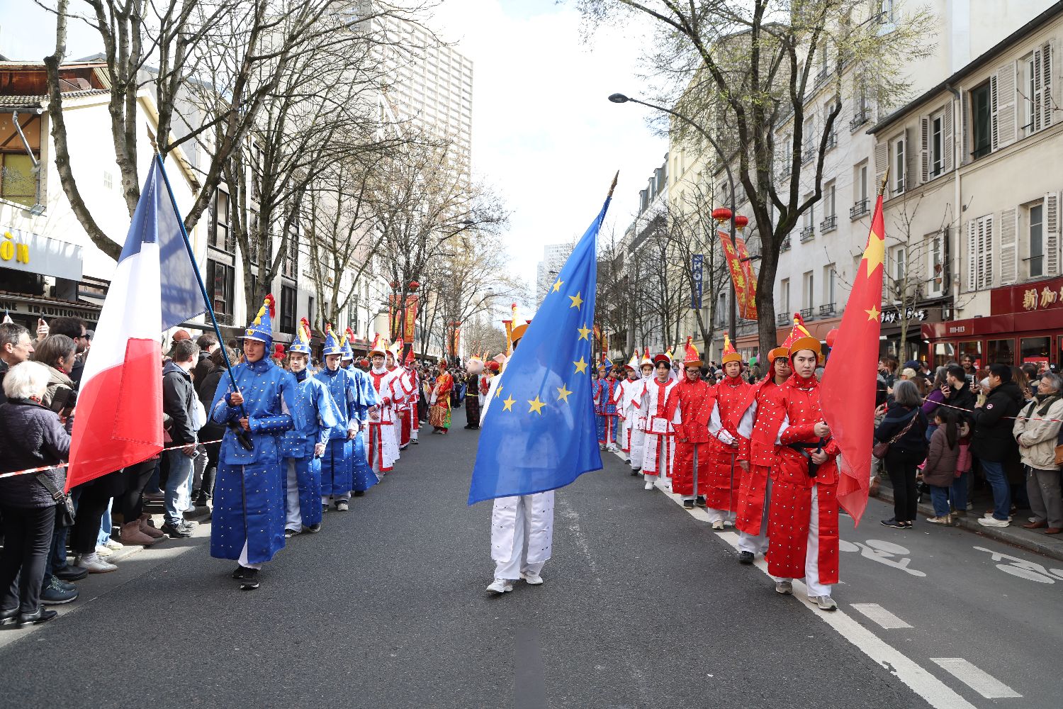 游行开始后,邓励夫妇、顾梅、帕特里克·卡拉姆、桑德琳·卢梭、埃马纽埃尔·格雷瓜尔、郑江秀文、郑桂珊(Navy Trinh)等主要嘉宾共同手扶法国华裔互助会旗帜,带领游行主体队伍沿路线前进。温暖的阳光照耀着约一公里长的游行路线,多个社团和文化、艺术组织组成的游行队伍在浓浓的年味中,化身一条流动的文化长龙徐徐前进,大量民众或聚集在街道两侧,或坐在街边高处,或打开住处窗户欣赏游行盛况,并掏出手机和提前准备好的相机拍摄记录。此外,游行队伍中来自亚洲其他国家及非洲的团队,也为整场游行增添了别样的喜悦气氛。