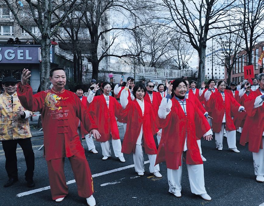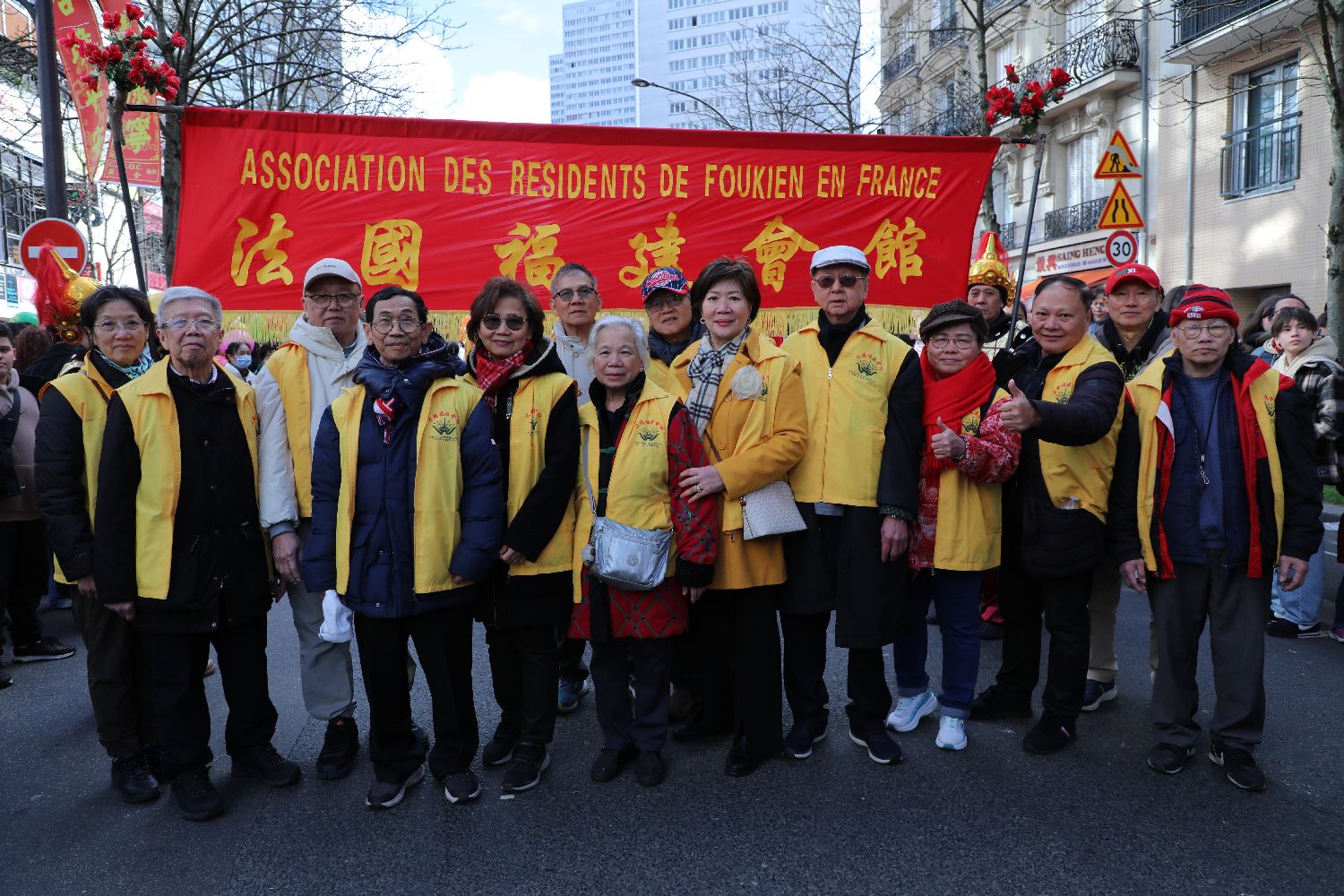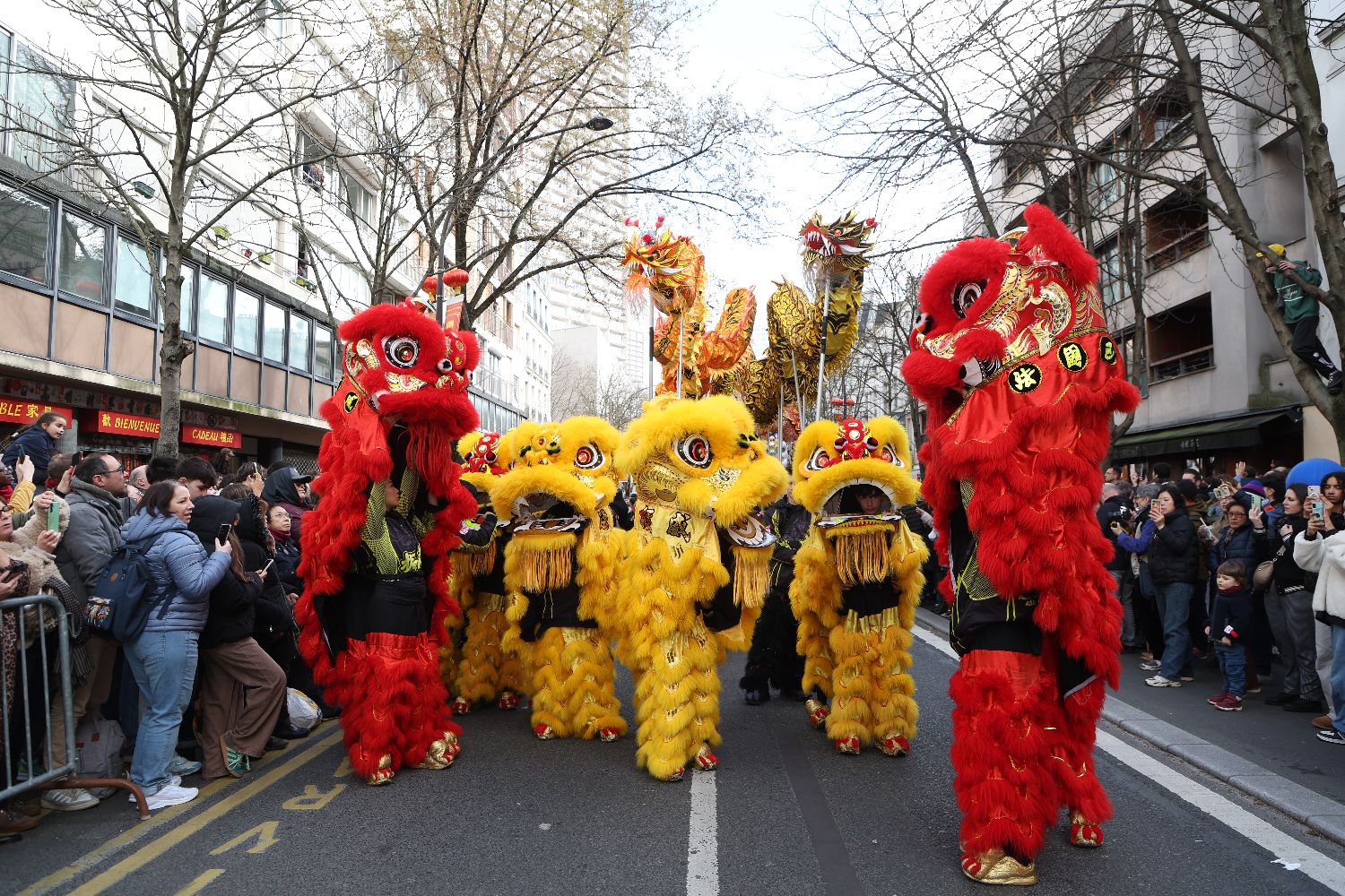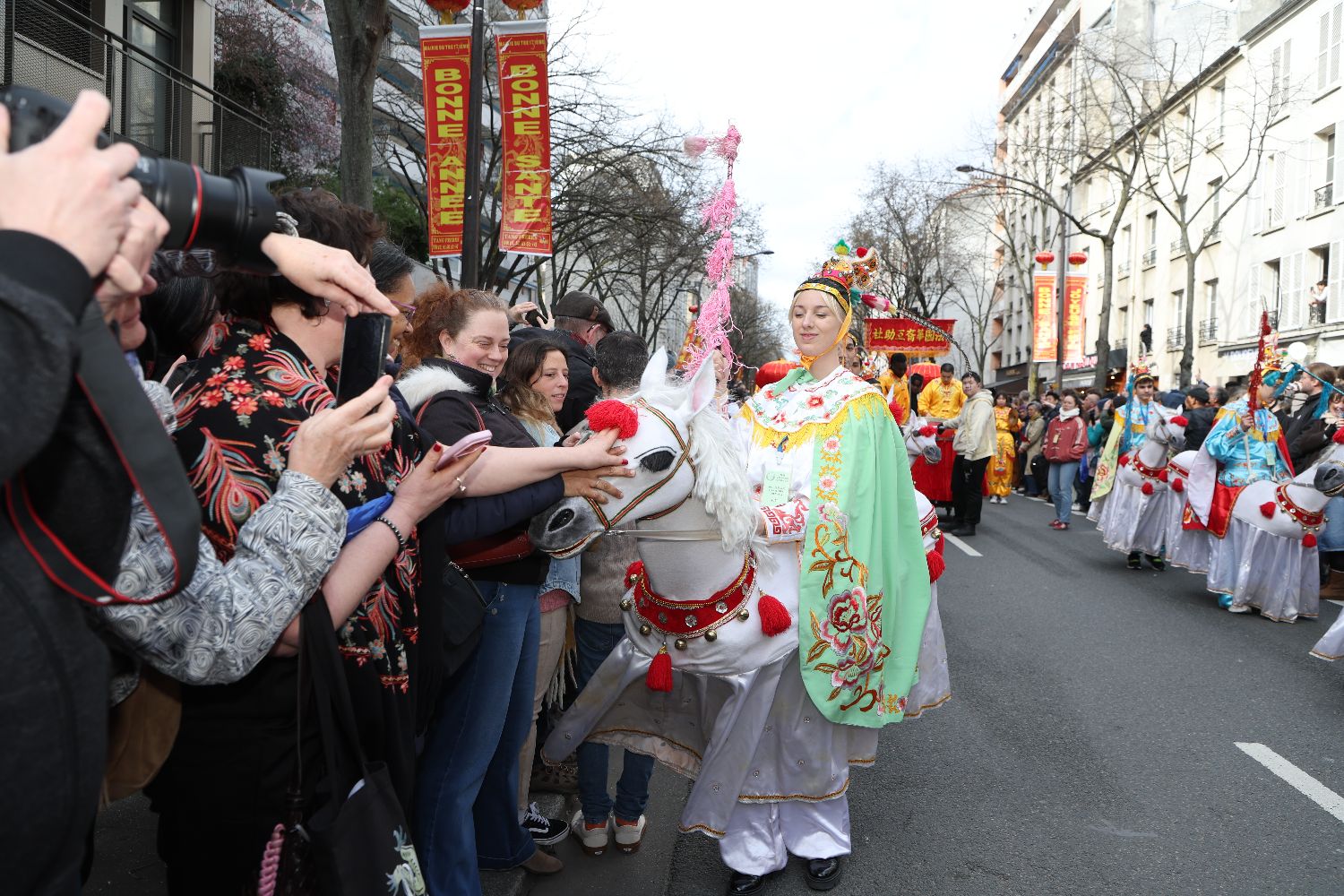 游行开始后,邓励夫妇、顾梅、帕特里克·卡拉姆、桑德琳·卢梭、埃马纽埃尔·格雷瓜尔、郑江秀文、郑桂珊(Navy Trinh)等主要嘉宾共同手扶法国华裔互助会旗帜,带领游行主体队伍沿路线前进。温暖的阳光照耀着约一公里长的游行路线,多个社团和文化、艺术组织组成的游行队伍在浓浓的年味中,化身一条流动的文化长龙徐徐前进,大量民众或聚集在街道两侧,或坐在街边高处,或打开住处窗户欣赏游行盛况,并掏出手机和提前准备好的相机拍摄记录。此外,游行队伍中来自亚洲其他国家及非洲的团队,也为整场游行增添了别样的喜悦气氛。