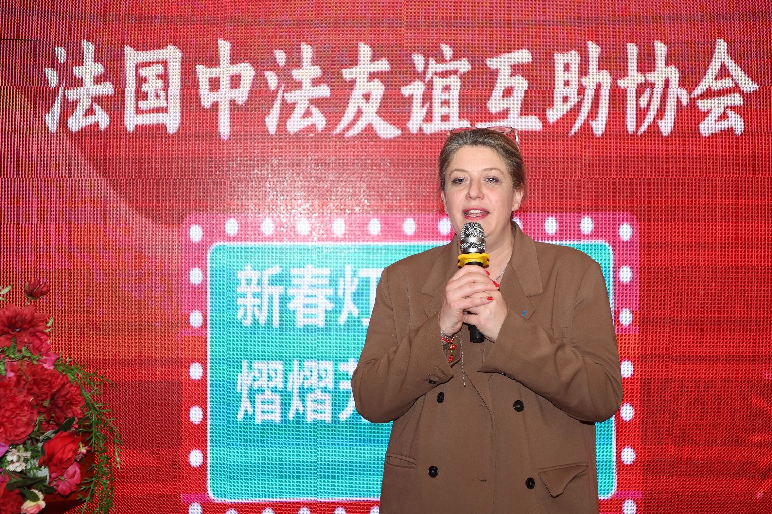 【欧洲时报记者马行健巴黎报道】当地时间2月28日,法国中法友谊互助协会在巴黎将军府大酒楼举办主题为“新春灯火映团圆,熠熠芳华暖人间”的新春晚宴,共庆春节、元宵节和即将到来的“三八”国际妇女节。巴黎大区欧拜赫维利耶市市长卡琳•弗朗克莱(Karine Franclet)、副市长田玲、法国华人律师协会会长韩博、法国中法友谊互助协会会长何建兴等,与来自中法各界及协会成员200余人齐聚一堂,共庆佳节。