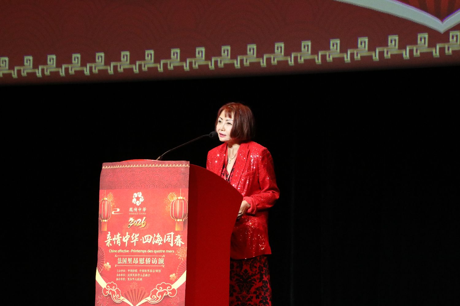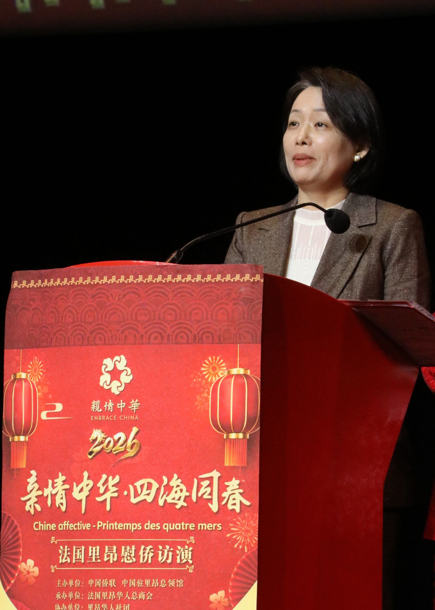 2026年“亲情中华·四海同春”慰侨访演欧洲团团长、中国侨联文化交流部副部长车壮丽表示,长期以来,广大海外侨胞胸怀祖(籍)国、情系桑梓,秉持中华民族勤劳智慧、自强不息的优良传统,在异国他乡团结互助、勇毅担当,既为住在国经济社会发展作出了积极贡献,也在弘扬中华优秀传统文化的舞台上不断发光发热,在促进中外文明交流互鉴中增光添彩。“你们的奋斗与奉献,值得永远铭记。”她希望演出以文传情,传递祖(籍)国对广大侨胞的关心与惦念,传递家乡亲人的温暖祝福;以文传声,讲述一个生机勃勃、欣欣向荣的中国;展现新时代中国人开放、包容、奋斗、追梦的动人故事。愿这场演出唤起大家对祖国和故乡的深情厚谊,凝聚侨心、汇聚侨力,共同书写更加美好的明天。