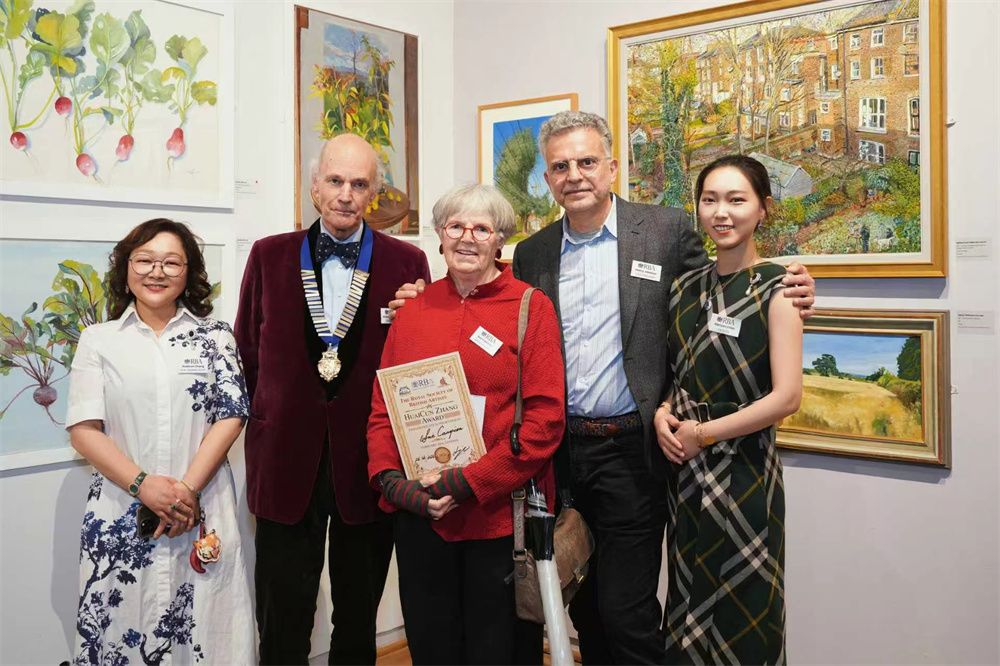 (左起)张怀存院士、RBA主席迈克尔·哈里森、获奖艺术家Sue Campion、RBA副主席亨利·贾布尔(Henry Jabbour)、RBA赞助人(Patron)陈贤妍博士合影。(图片来源:主办方供图)