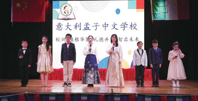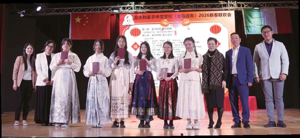 【欧洲时报记者托特罗马图文报道】2月28日下午,意大利孟子中文学校在罗马Sala Vignoli剧院举行《金马迎春》2026新春联欢会。中国驻意大利大使馆领侨处领事刘佳鑫、焦炻榭,意大利中国总商会会长林建芬,蜂巢酒店董事长徐银萍,意大利孟子中文学校创始人解颖,以及孟子中文学校师生及家长齐聚一堂,共庆马年新春。