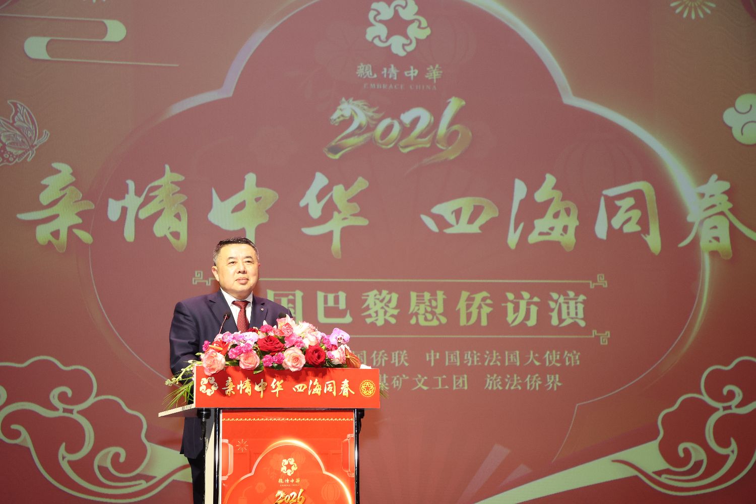 蔡君柱在致辞中表示,“亲情中华·四海同春”不仅是一场演出,更是一份跨越山海的牵挂,是祖国对海外儿女深情厚意的生动体现。每一次旋律响起,每一段舞姿呈现,都是祖国对海外侨胞的深情问候。“中国年”正日益成为“世界年”,这不仅是中华文明影响力,不断提升的象征,更是文明交流互鉴、民心相通的重要成果,而“亲情中华·四海同春”的到来,将为这场轰轰烈烈的春节庆祝活动画上圆满的句号,更将激励我们继续在海外讲好中国故事、讲好中国文化故事、讲好中法文化交流的故事。