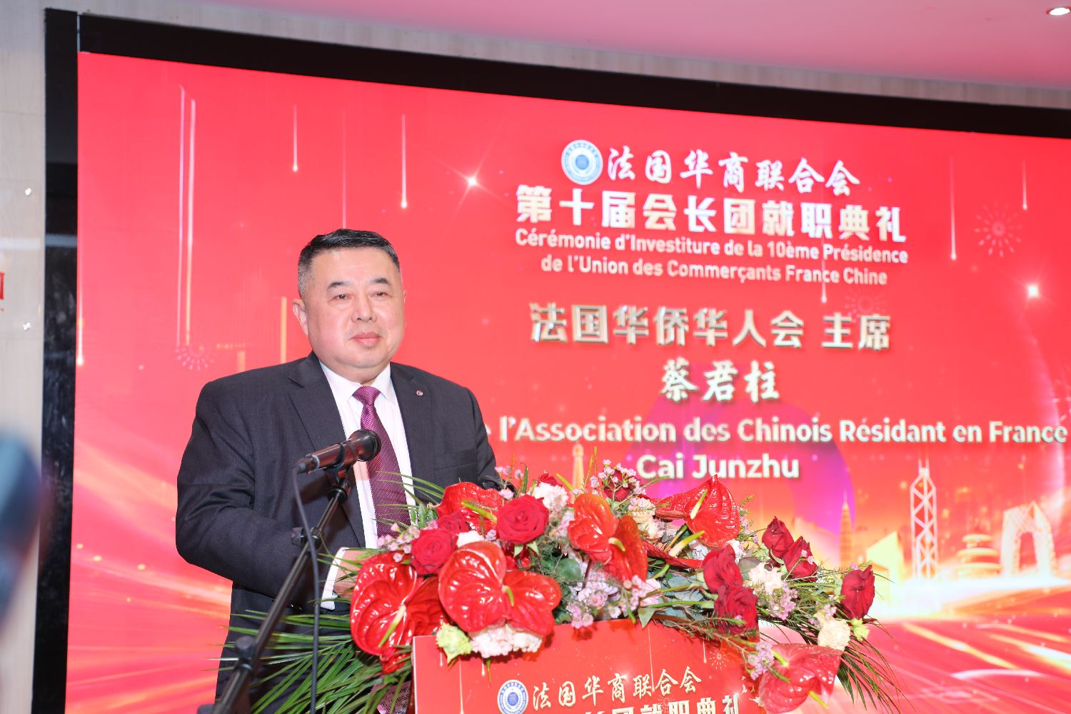 法国华侨华人会主席蔡君柱代表旅法侨界向新一届会长团表示祝贺。他高度赞赏协会在团结融合方面的标杆作用。希望新一届会长团发挥协会优良传统,团结带领华商开拓创新,勇立潮头,为侨社的和谐发展贡献力量。
