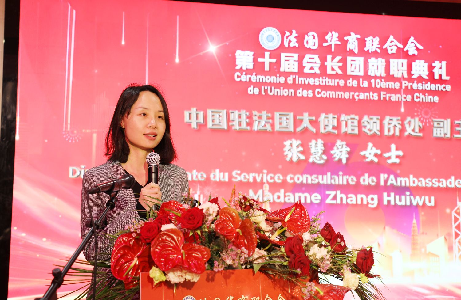 张慧舞代表中国驻法使馆对新一届会长团表示祝贺,她表示,协会成立以来,始终来持团结侨商、服务侨社、促进中法经贸合作与民间友好的创会宗旨,在积极履行社会责任、推动华商融入当地社会、促进中法经贸往来、弘扬中华优秀传统文化等方面发挥了重要作用。她指出,不久前李强总理在政府工作报告中指出,要维护海外侨胞和归侨侨眷和发权益,更好凝聚侨心侨力,体现出祖国对海外侨胞和归侨侨眷地位作用的重视。希望法国华商联合会在孙建丽会长和新一届会长团的带领下,厚植家国情怀,与祖(籍)国相向而行,同频共振,积极参与和支持祖(籍)国发展建设,同时团结全体会员,不断提升会务水平,为和谐侨社建设、推动中法友好做更多实事好事。