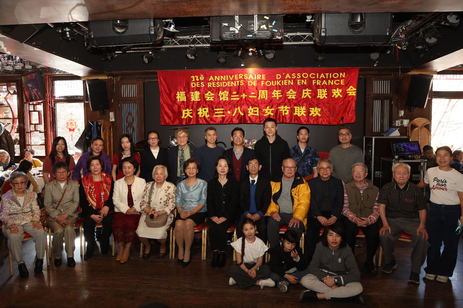 【欧洲时报记者马行健巴黎报道】当地时间3月15日,法国福建会馆在巴黎13区中国城大酒楼举行活动,庆祝协会成立32周年及“三八”国际妇女节。中国驻法国大使馆领侨处副主任张慧舞、秘书查君酽、法国福建会馆会长戴英泰、法国华裔互助会常务副会长兼妇女组主任黄梦鸾、法国番禺富善社执行会长麦辛、法嘉华旅行社代表周翀等出席活动,200余位法国福建会馆会员及亲友参加活动。