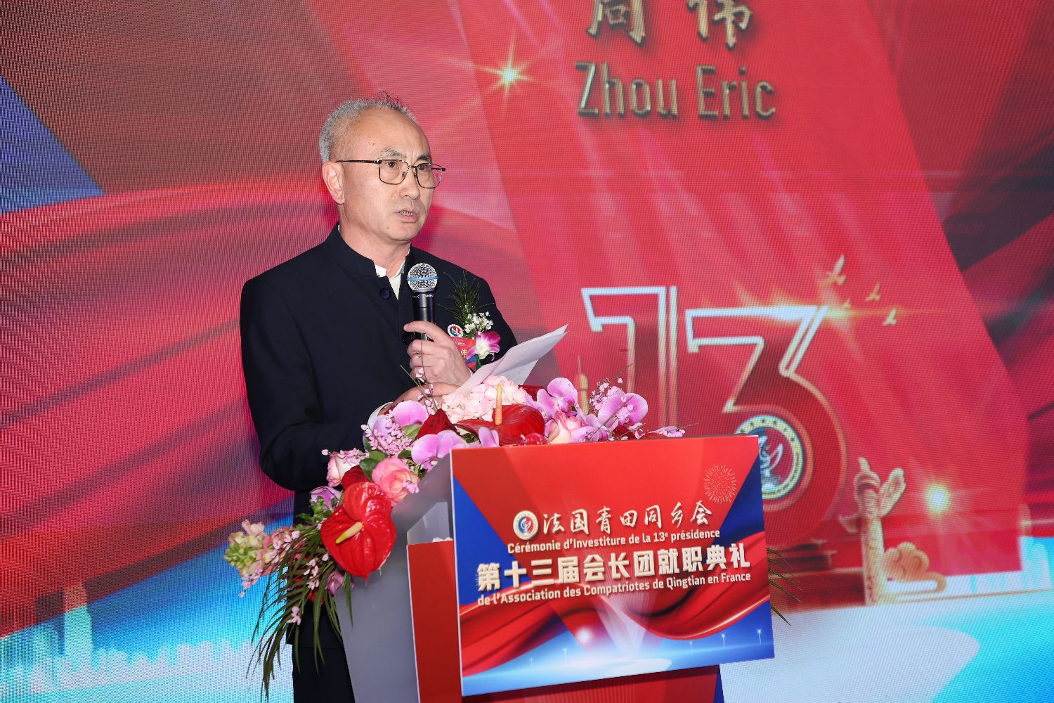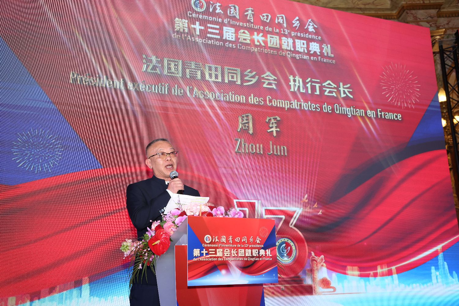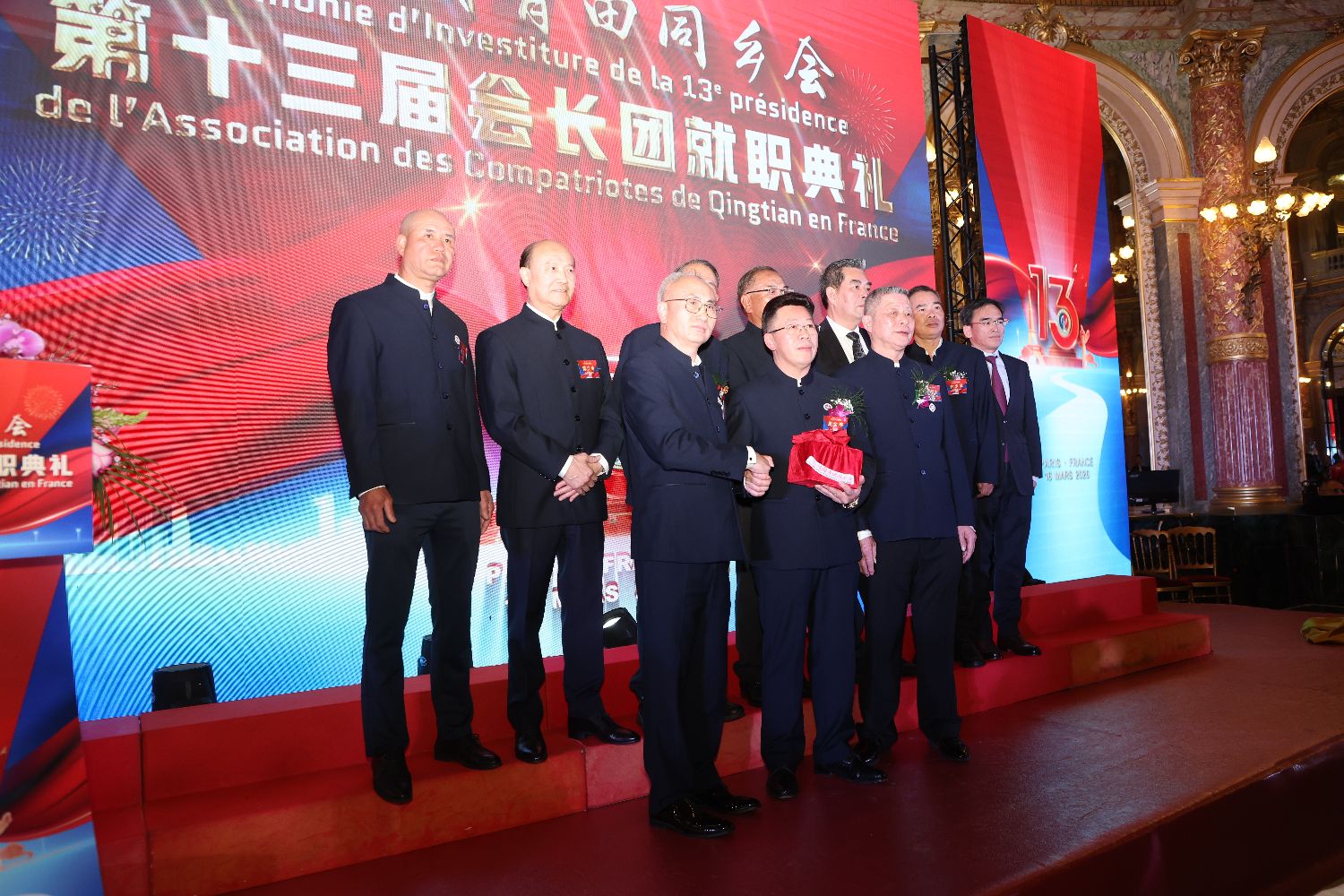 就职典礼进行期间,周伟与周金伟在监事长王献洪、历届会长、荣誉会长及全场来宾的见证下,完成会印交接。第一副会长王献伟、妇女主任包雪玲先后宣读来自中华海外联谊会、中国侨联等的贺电。在喜庆隆重的氛围中,周金伟带领同乡会合唱团共同演唱了歌曲《歌唱祖国》,随后现场还进行了包括音乐、舞蹈、武术在内的多轮文艺表演,在场人员纷纷向第十三届会长团的就职表示祝贺,并祝愿法国青田同乡会未来会务昌隆,一帆风顺。