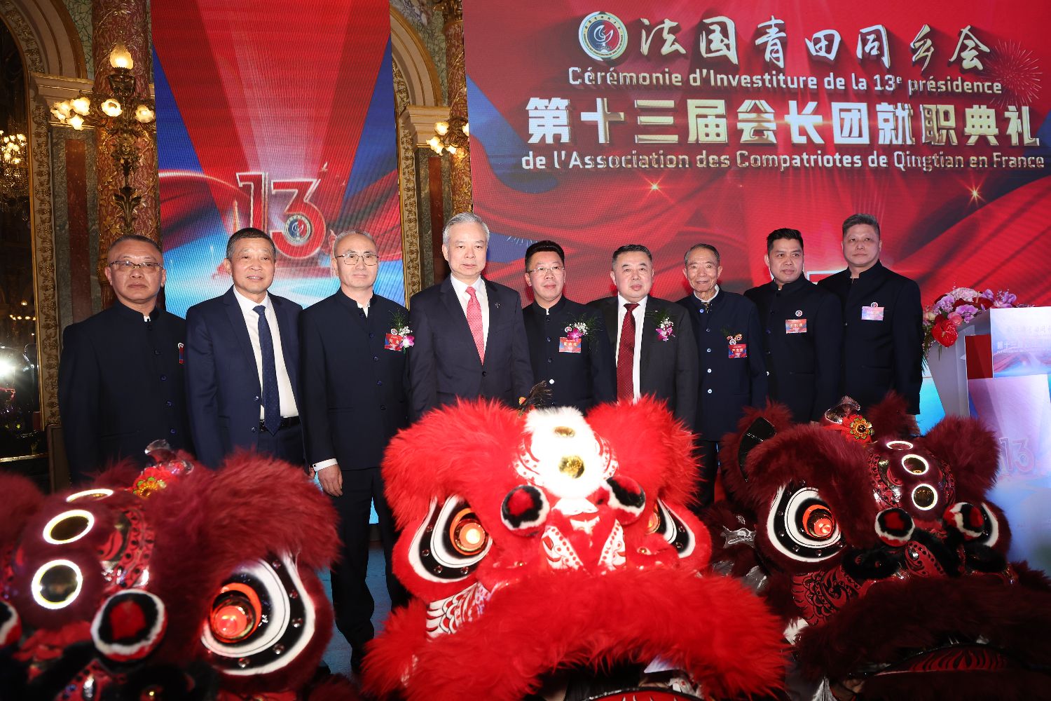 庆典开始前,陈力、卓旭光、蔡君柱、法国青田同乡会第十二届会长周伟、第十三届会长周金伟、创始会长严志照、执行会长周军、常务会长王利勇、第一常务副会长王献伟共同登台为醒狮点睛,随后周军宣布庆典正式开始,全体人员起立奏唱中法两国国歌,随后落座观看法国青田同乡会宣传视频。