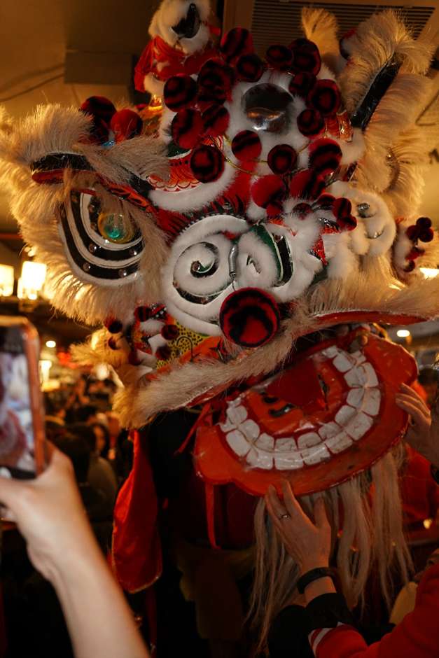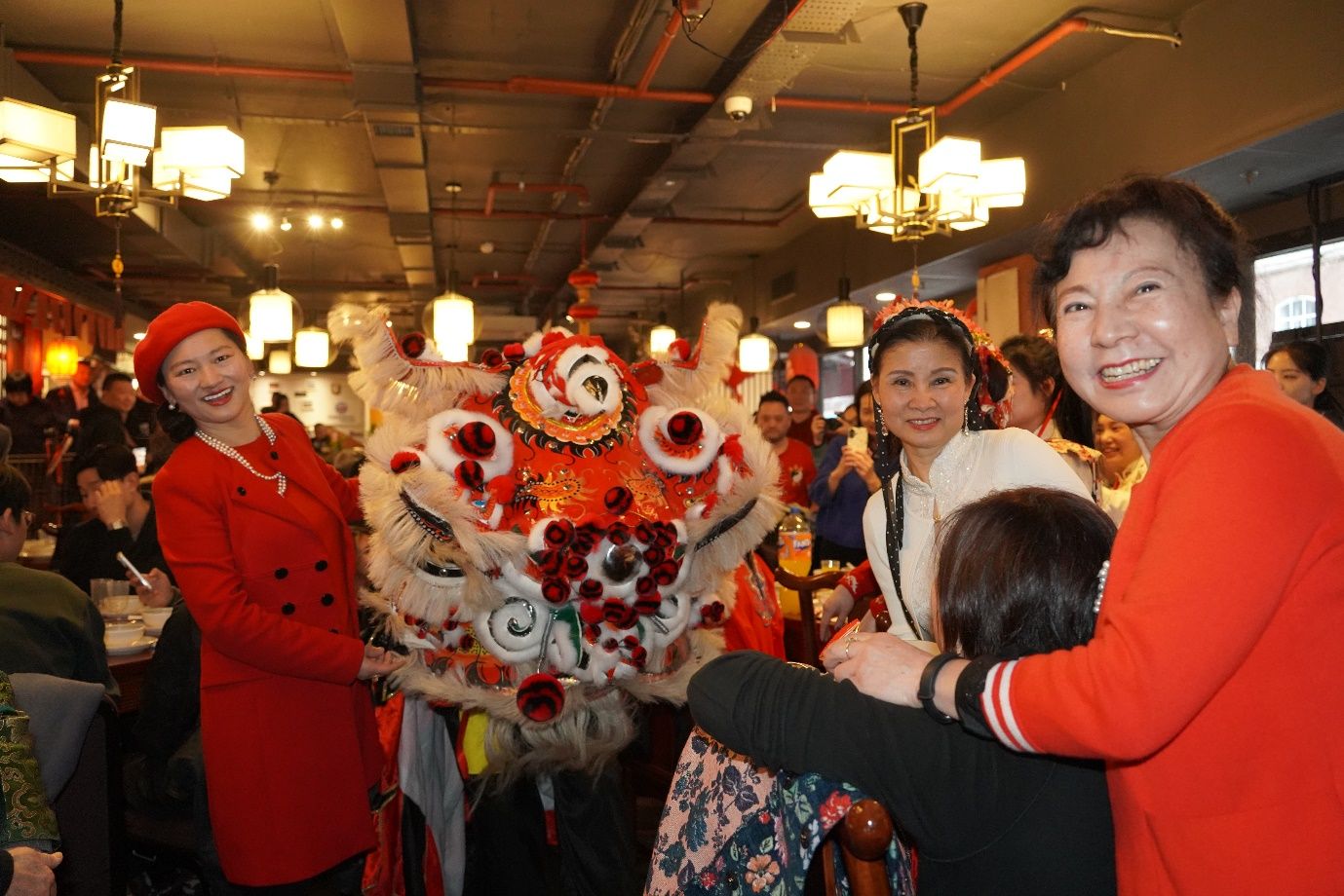 旅英侨胞与醒狮互动,共贺新春喜气洋洋。