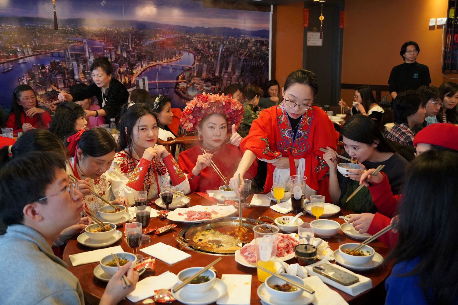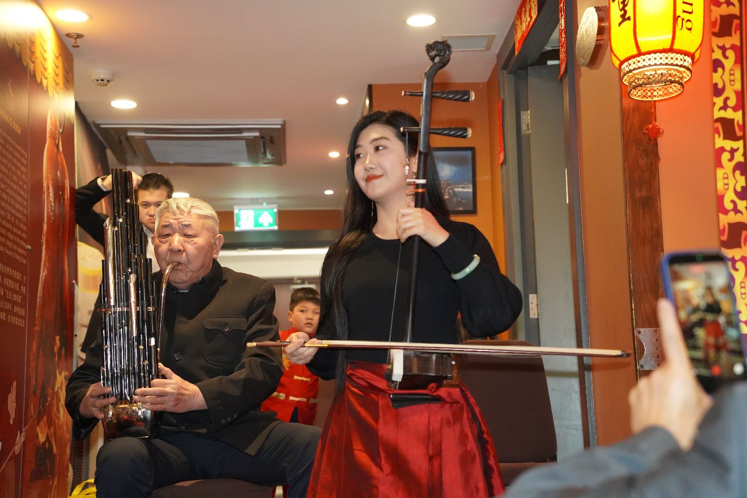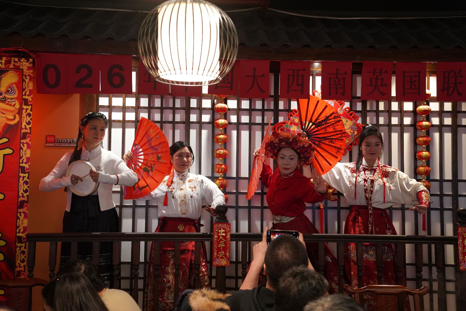 活动现场还呈现了一系列具有浓厚中华文化特色的文艺节目。中英文化艺术促进协会带来的《峨眉武术功夫扇》刚柔并济、气势昂扬,展现了中华武术的独特魅力;著名旅英民乐演奏家郭艺与孙甜联袂登台,为大家演奏笙与二胡合奏《赛马》和《我爱你中国》,旋律激昂悠扬,赢得阵阵掌声;来自英国皇家音乐学院的解天一带来京剧流水片段及京歌选段,将中国传统戏曲艺术的韵味与感染力呈现在海外舞台,为活动增添了浓厚的文化氛围。在热气腾腾的火锅与欢声笑语中,来自不同领域的嘉宾与侨胞共叙乡情、畅谈交流,现场气氛喜庆而温馨。