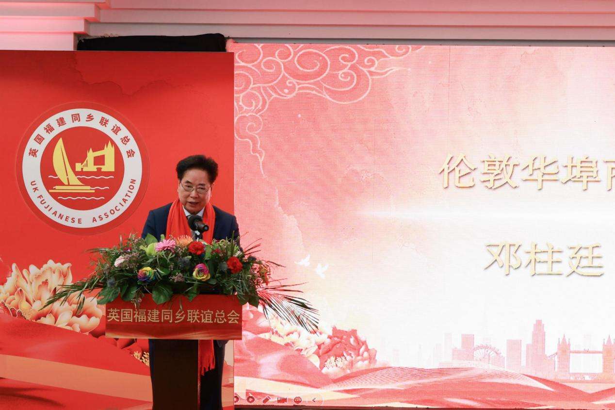 伦敦华埠商会主席邓柱廷OBE发表致辞。(图片来源:主办方供图)