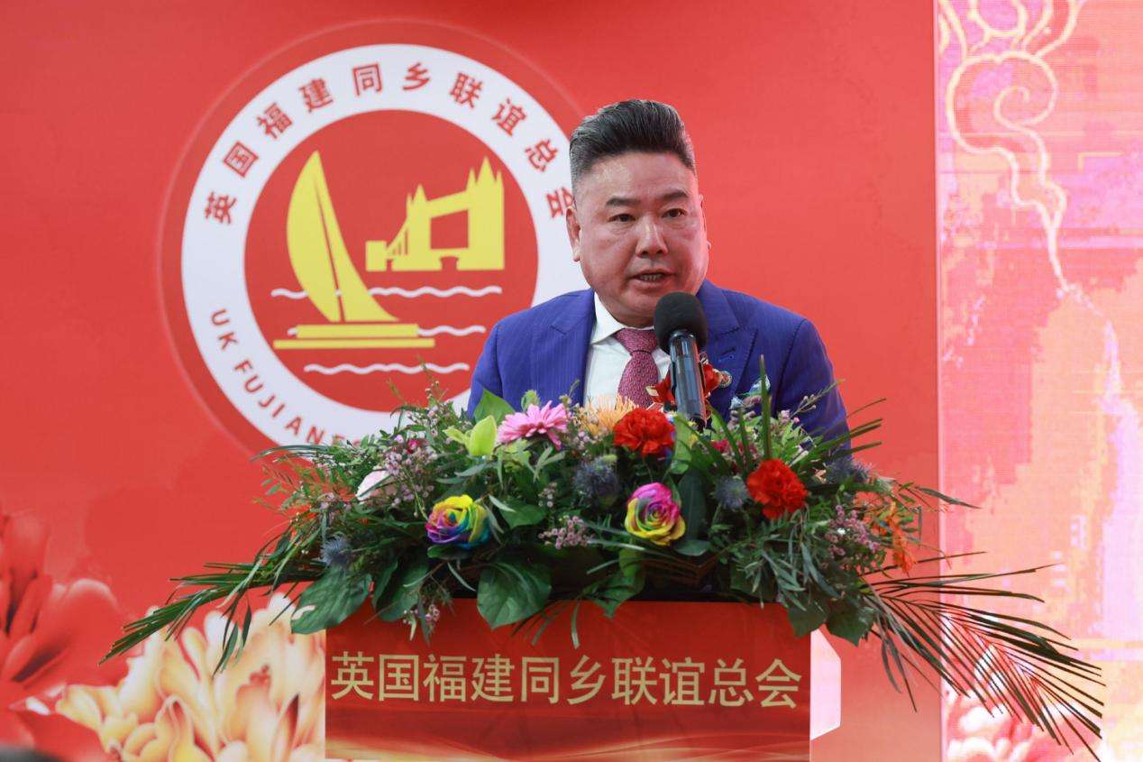 英国福建同乡联谊总会新任第四届会长林新献发表致辞。(图片来源:主办方供图)