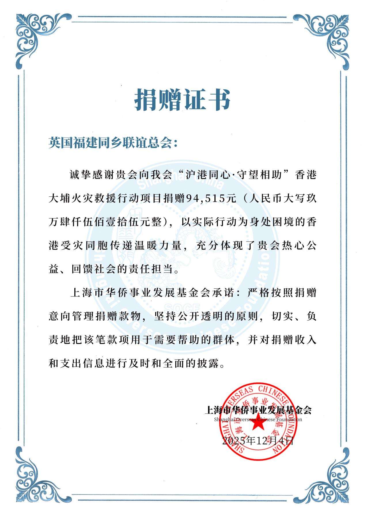 香港大埔火灾救援捐赠证书。(图片来源:主办方供图)