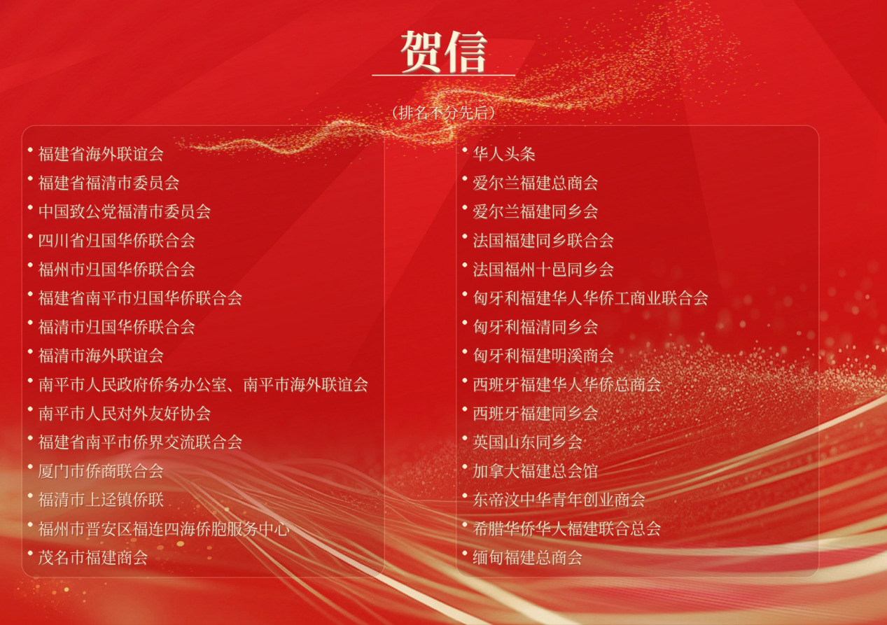 大会期间,主持人宣读了来自海内外30家机构和友好侨团发来的贺信,其中包括福建省海外联谊会、福建省福清市委员会、中国致公党福清市委员会、四川省归国华侨联合会、厦门市侨商联合会、法国福建同乡联合会、匈牙利福建华人华侨工商业联合会、西班牙福建同乡会、加拿大福建总会馆、缅甸福建总商会、希腊华侨华人福建联合总会、爱尔兰福建总商会、华人头条等。字里行间饱含着海内外各界对英国福建同乡联谊总会第四届就职庆典的热烈祝贺与美好祝愿,也充分体现了社会各界对总会发展的关心与支持。