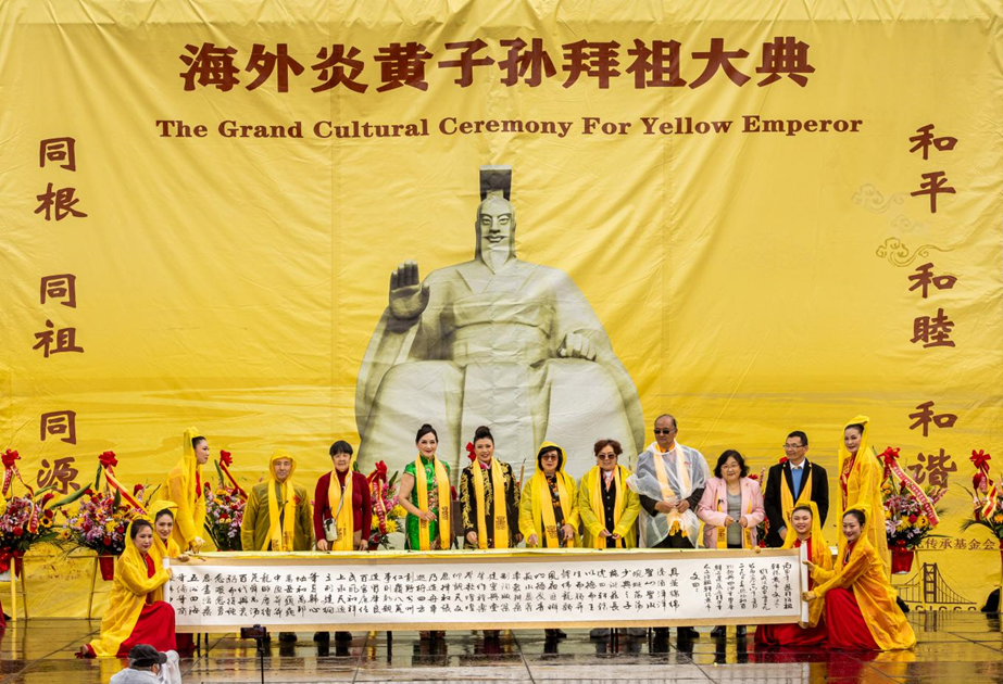 醒狮腾跃、锣鼓铿锵。马世云财务长、美国加州参议员威善高、陈小焱议员、索诺玛市市议员丁骏辉、中华妇女联合会会长何孔华等政要及侨界代表依次登台,向黄帝像敬献花篮,以庄重之礼寄托对人文始祖的敬仰与追思;中文演讲比赛获奖者、青少年代表与嘉宾共同献花,表达敬意;肇庆总会馆、三邑总会馆等侨团代表及文化界人士依次净手上香,追思祖德祖恩,祈愿和平和睦;全体嘉宾肃立,向黄帝像三鞠躬;大典组委会总指挥胡长桥递交拜祖文,丁骏辉议员现场恭读。