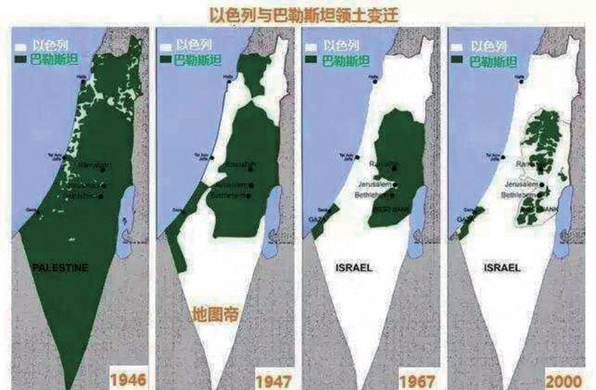 犹太复国主义运动,在一战以后就正式开始。先是大批犹太人到那里购买土地房屋,然后要求自治。(左起第一图)两战之间,只有当时的前殖民方英国对此关注。但二战以后,由于德国希特勒的残暴屠杀犹太人的历史,世界尤其是欧洲人对犹太人的愧疚感剧增,于是才有了1947年联合国的以巴分治第181号决议(第二图)。这份决议公布后的第二天,以色列国就宣布成立。但周边的六个阿拉伯国家都不承认,认为这个方案太过偏袒以色列,立马开打。到1948年7月停火时,仅缩小的加沙地带还在埃及占领之下,同样缩小的西约旦但包括东耶路撒冷被约旦人吞并。第二次中东战争又称苏伊士运河战争,内容略去。更重要的第三次中东战争发生在1967年5月,也是阿方联军发动,但一共就打了6天,再次以阿方联军完败收场。以色列夺占西奈、加沙、戈兰高地和整个耶路撒冷,奠定了以色列今日版图的基本面(第三图)。第四次中东战争发生于1973年10月。埃及和叙利亚主动攻击西奈和格兰高地。局面是先赢后输。结局比1967年略好。1982年,埃及收回西奈半岛,并与以色列单独媾和与建交。第五次中东战争发生于1982年,仅在以色列和黎巴嫩之间。细节略去。这以后,以色列就没有再和周边国家发生正式的战争。阿拉伯国家也明白了动武是赢不了的,纷纷退出对这片土地的争夺。这样,以色列和周边的阿拉伯国家的争执就退化成了以色列和巴勒斯坦人在那片土地上的内部争执。世称以巴之争。