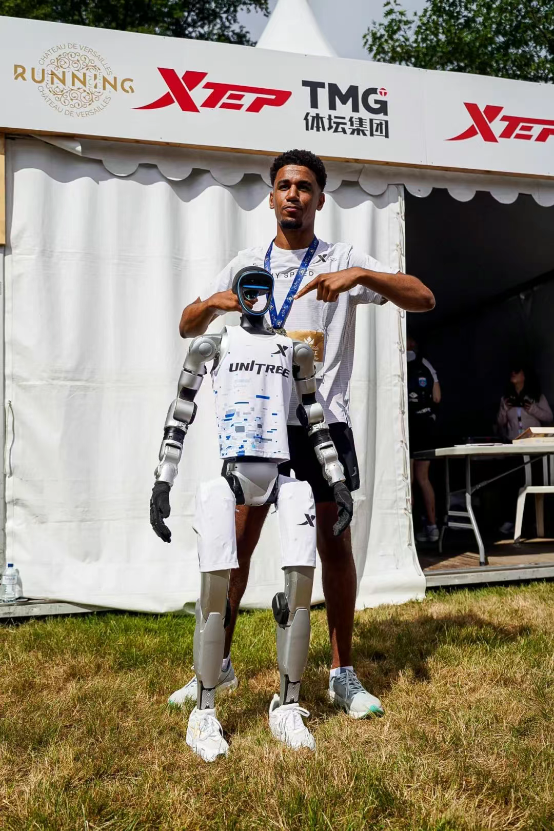 一名参赛者与宇树科技机器人合影。