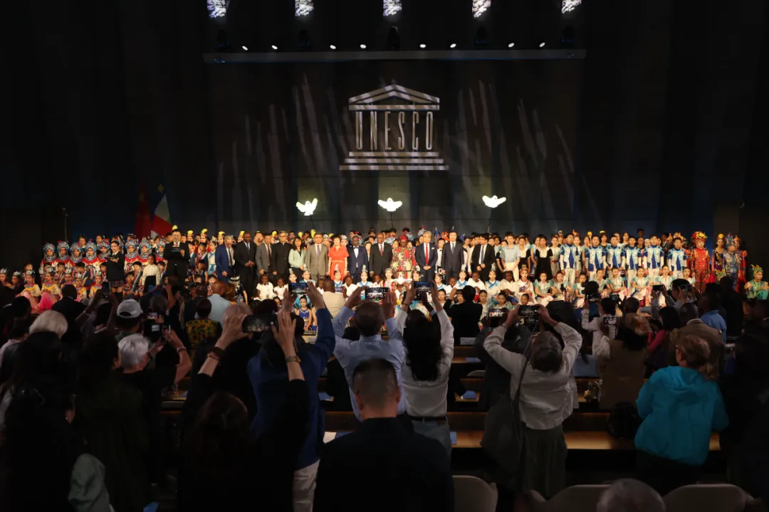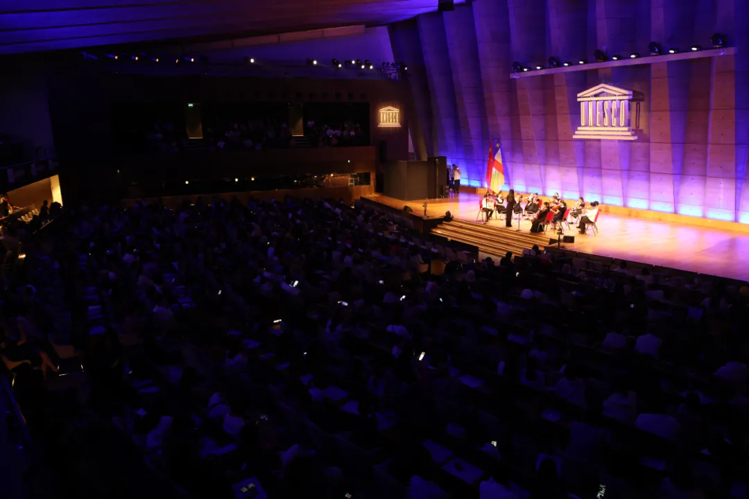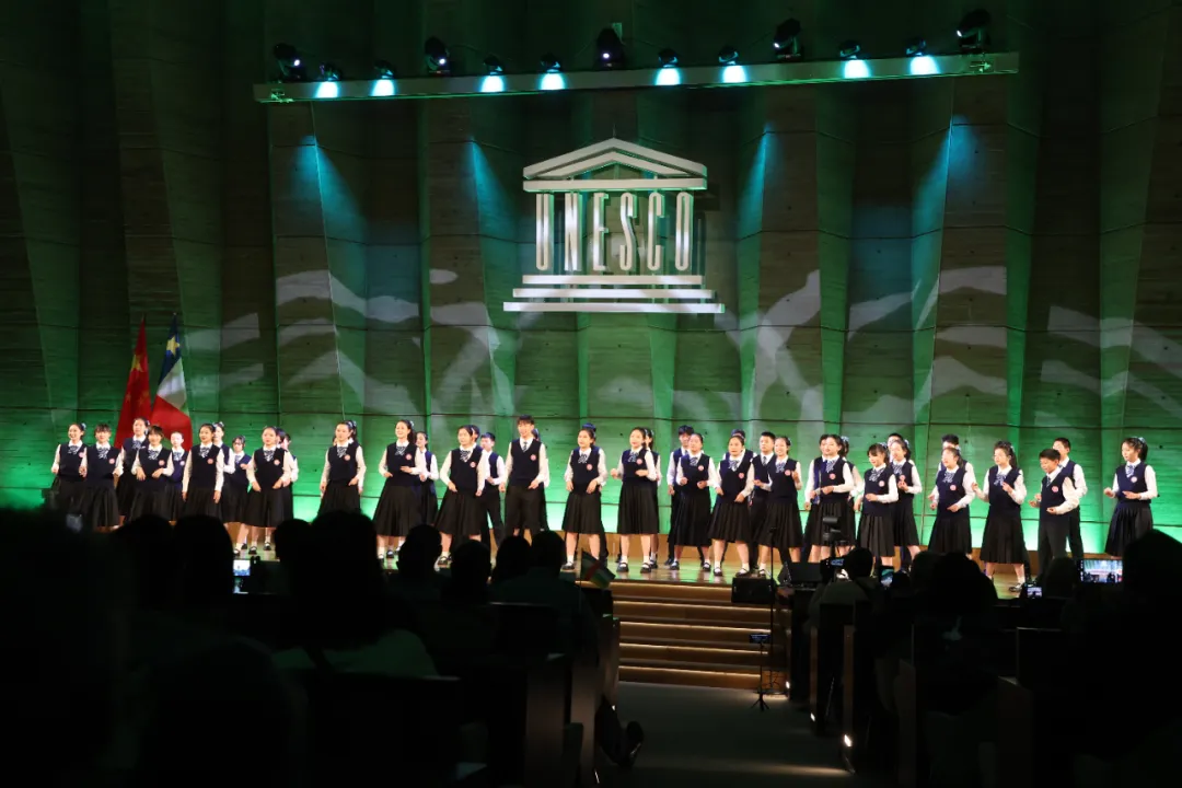 【欧洲时报记者马行健巴黎报道】当地时间8月5日晚,为纪念世界反法西斯战争胜利80周年,庆祝联合国教科文组织成立80周年,由联合国教科文组织协会世界联合会、中非共和国驻法兰西共和国大使馆、中非共和国常驻联合国教科文组织代表团、北京圣陶国际教育文化交流中心共同主办,以“扬起和平的风帆”为主题的2025年亚非欧中小学生文化艺术交流专场演出活动,在联合国教科文组织总部成功举行。