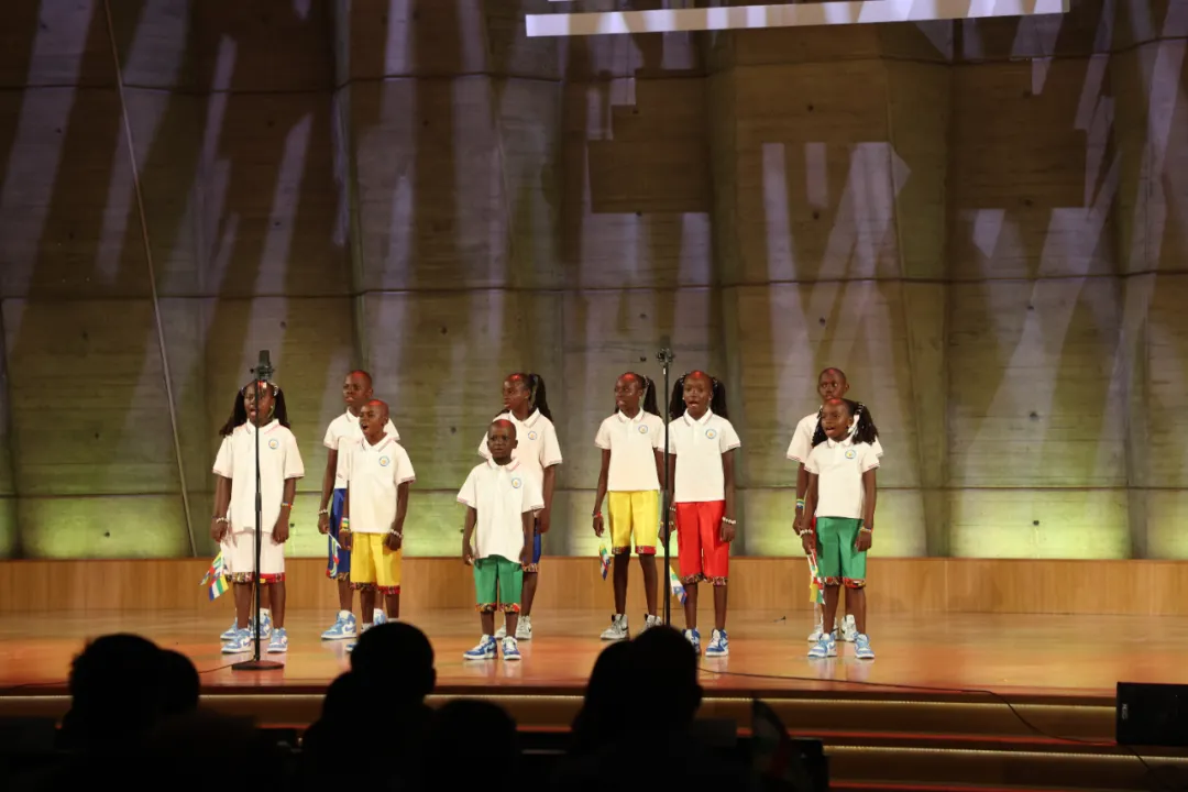 中非孤童艺术团儿童用中文演唱《在希望的田野上》。