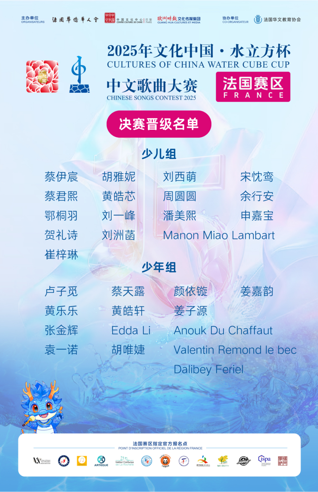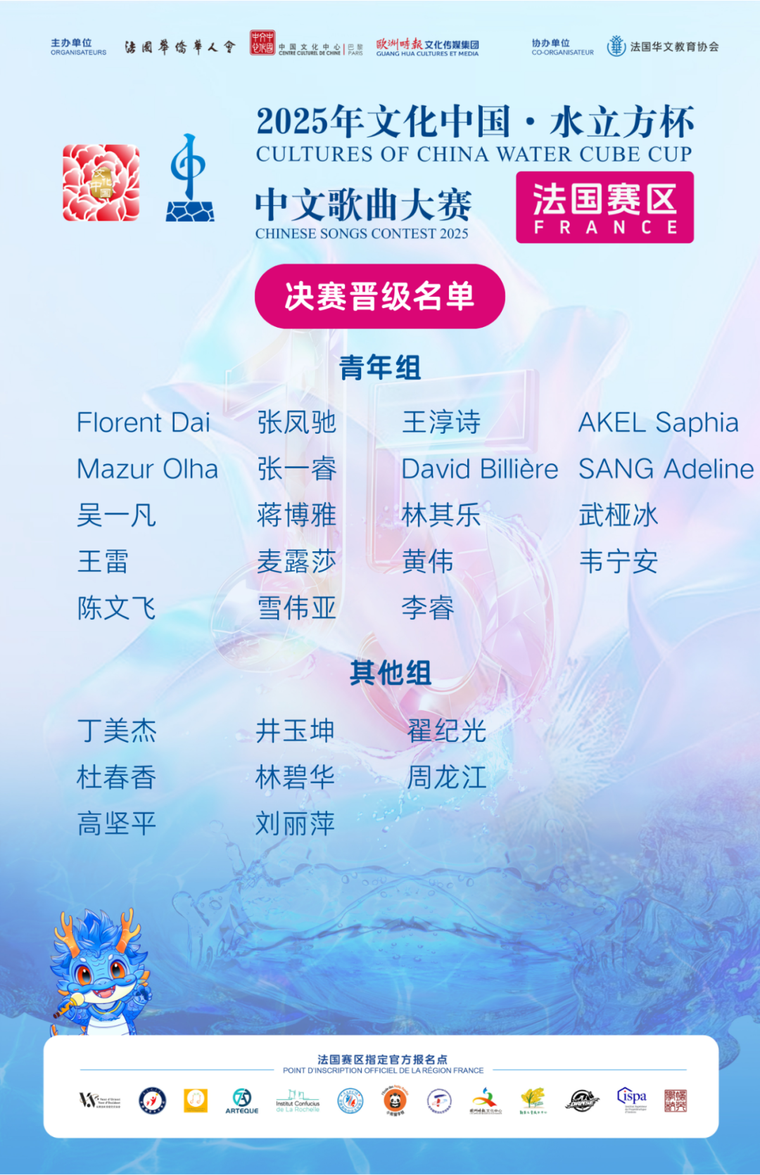 2025年“文化中国·水立方杯”中文歌曲大赛法国赛区 晋级名单海报。(图片来源:欧时大参微信公号)