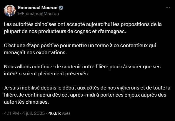 法国总统马克龙周五4日表示,中方接受了大多数法国干邑和雅文邑生产商提出的价格承诺方案,并称这是“为解决出口争端所迈出的积极一步”。