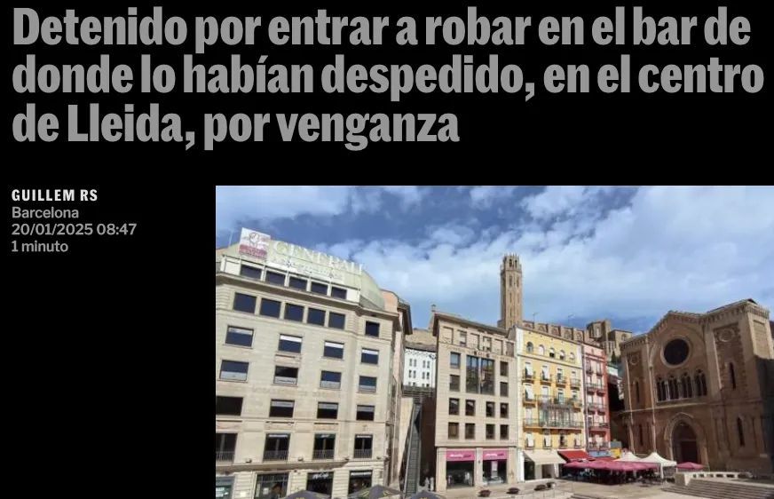 El Caso网站报道,莱里达市近期发生了不少抢劫案。但这宗案件有所不同。监控录像中出现了两名男子。其中一人是酒吧熟人,原来这名男子几天前被酒吧解雇,为了报复酒吧老板,他在凌晨进入酒吧。而且他进酒吧不需要砸碎门或者玻璃,因为他有钥匙。